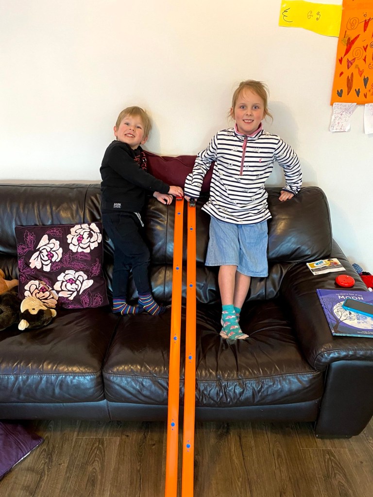 James received some Hot Wheels cars and track for his birthday. I have fond memories of just running cars down long bits of track at my grandparents’ house so, to bolster the fun, I’d ordered a lot of additional track and today was the day to crack it open. There was a lot of excitement and joyful squealing from both kids and car after car whizzed down the track, did a small jump and then crashed in to the previous cars. Simple pleasures are often the best!