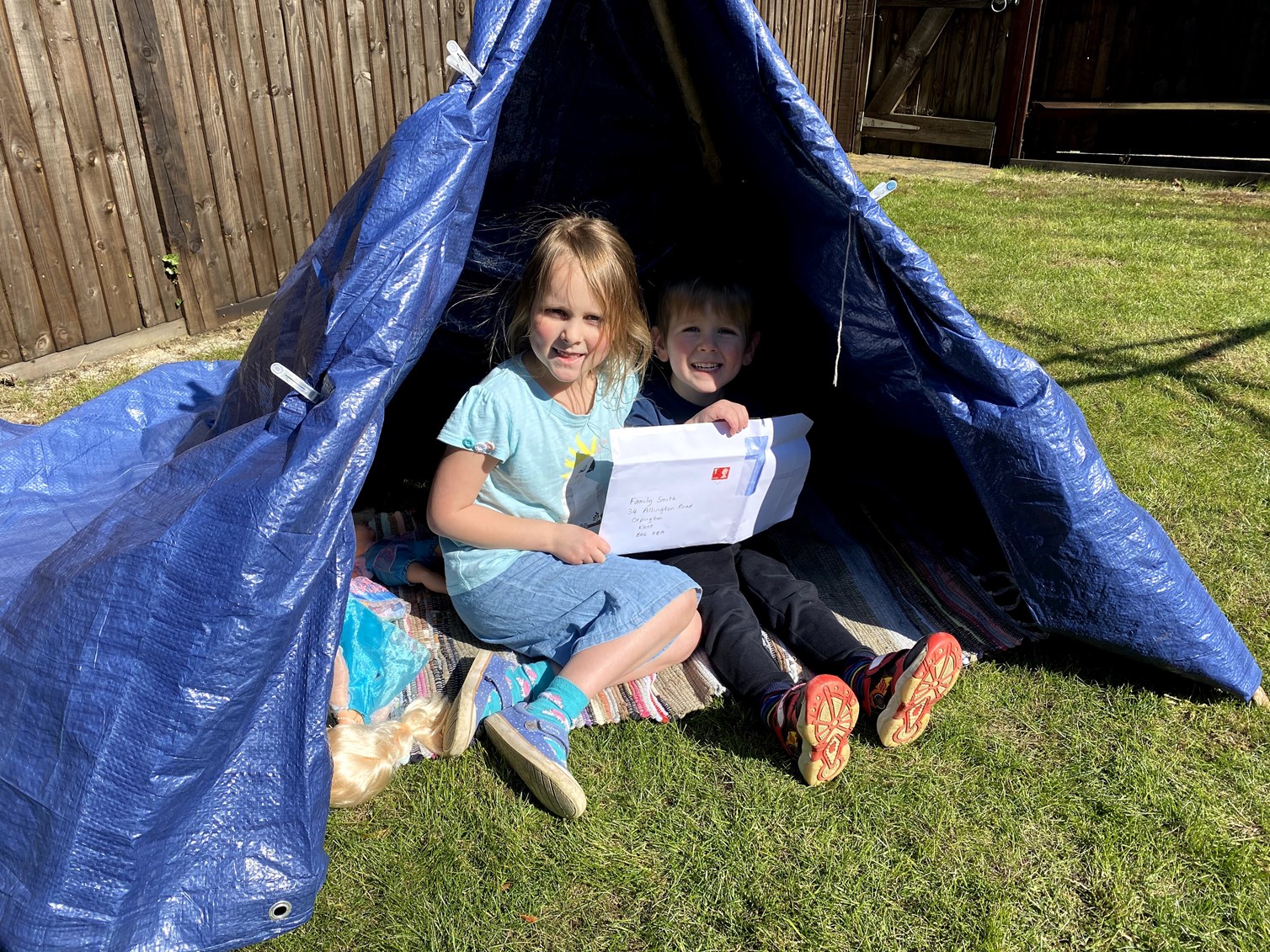 For lunch Megan thought the kids would enjoy a change of scenery. She quickly lashed together four wooden staves in the garden and covered them with a groundsheet to create the ultimate lunchtime picnic teepee. Not only did the children enjoy their lunch in their makeshift den, but they also opened their first “lockdown letter” from Grandma Lindsey and Grandpa Lawrie.