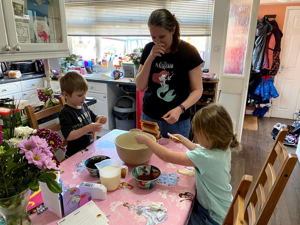 We did have a cooking success later in the day though. Megan and the kids worked together to make one of the finest bread puddings I’ve ever eaten. What was most impressive was Megan bodging together a very serviceable (and delicious) mixed spice mix from the hodgepodge array of spices we have in the larder. The resulting pudding was too delicious to keep to ourselves so Megan packed up a few slices and made a couple of doorstep deliveries to Emily and Gemma. Both were exceedingly grateful and asked Megan to confirm that the three slices they’d each received actually counted as just one serving.
