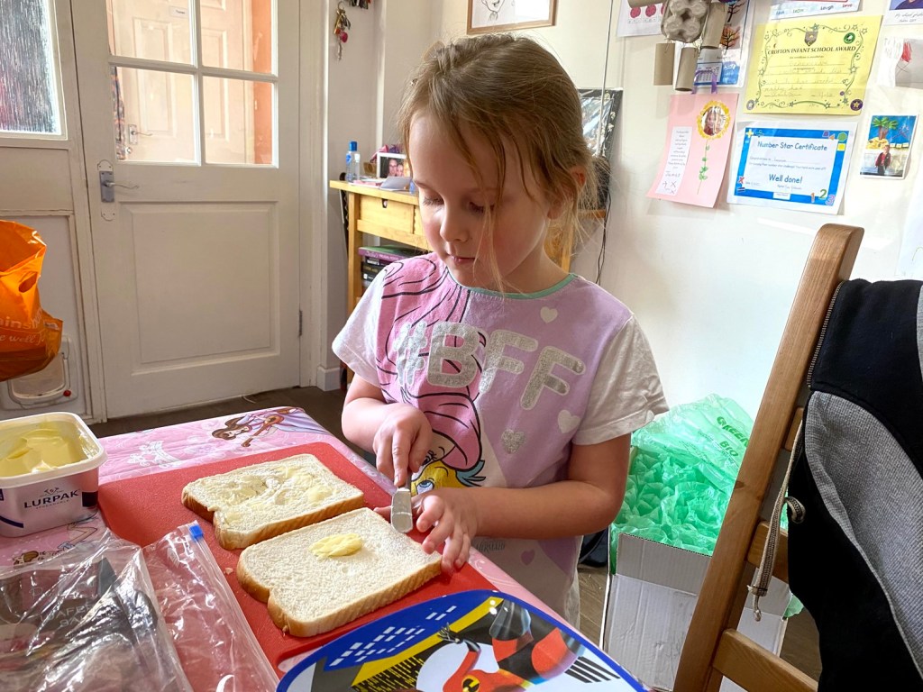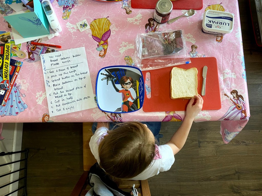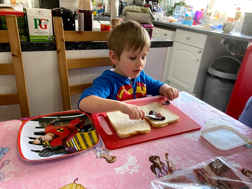 Genevieve’s next task involved understanding how to write a set of instructions. So, we discussed the process of making lunch and both kids made sandwiches with instructions. Genevieve insisted on salami but James loves a jam sarnie. Both opted for Frazzles and followed it up with half an iced finger! Yum!