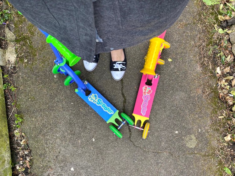 After lunch we wanted to get some fresh air so I set off with lots of gusto and positivity, 2 children, 2 scooters and 2 helmets. I think we had done around a quarter of my intended route when James announced he no longer wanted to scoot or wear his helmet. Then, when we were halfway round (still at the top of the road, but I was not about to give up), Genevieve’s scooter wheel came off. Cue me giving her James’s scooter, and carrying hers instead, followed by screams from James at wanting his scooter back. Honestly. We successfully finished said walk, with me carrying both scooters, James carrying a wheel, and Genevieve with both helmets.