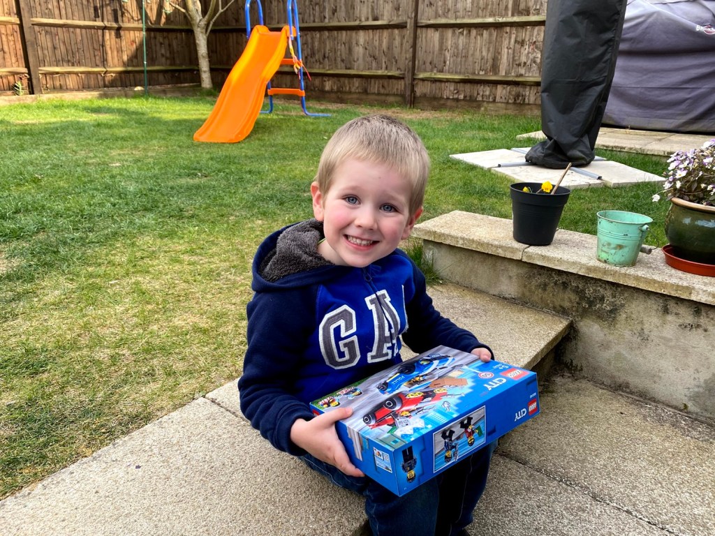 Some of our lovely friends dropped a care package off for Stephen (including Lucozade, Fisherman’s Friend lozenges, vitamin C tablets and giant Wotsits), and also kindly included a birthday present for James (they had had it since his birthday just before lockdown). He was most excited to open it – race car Lego with a goodie and a baddie!