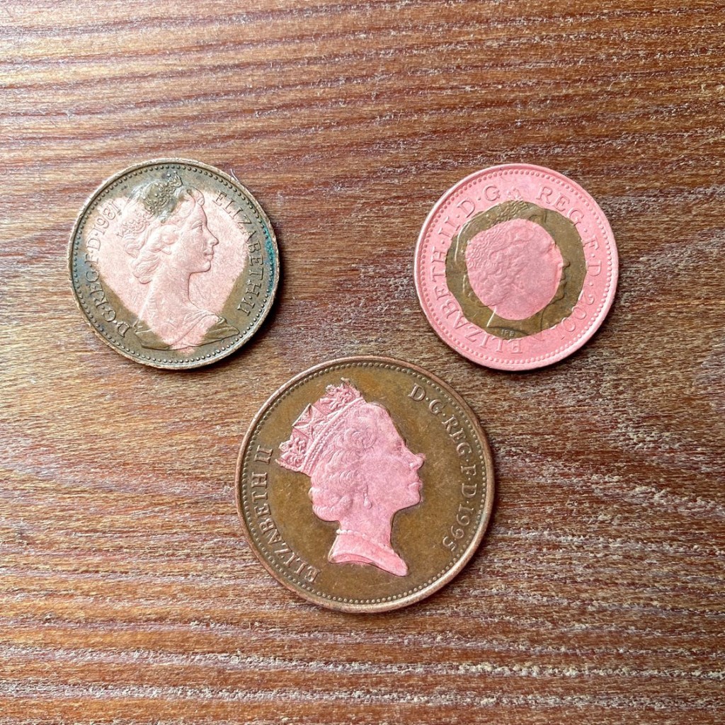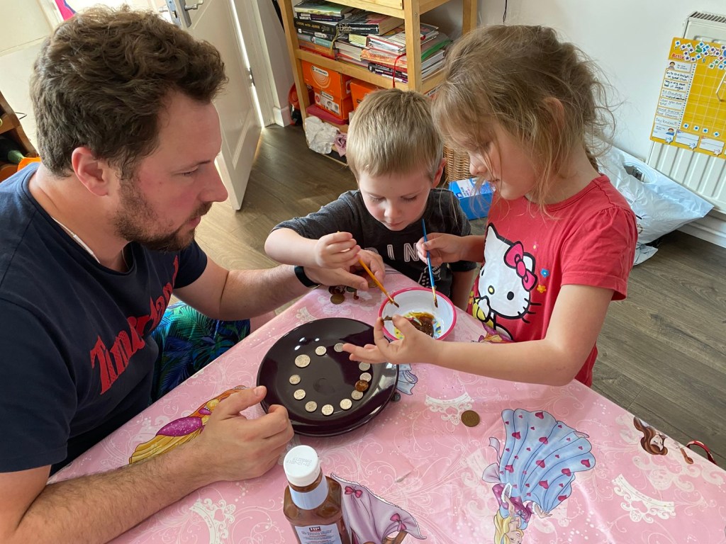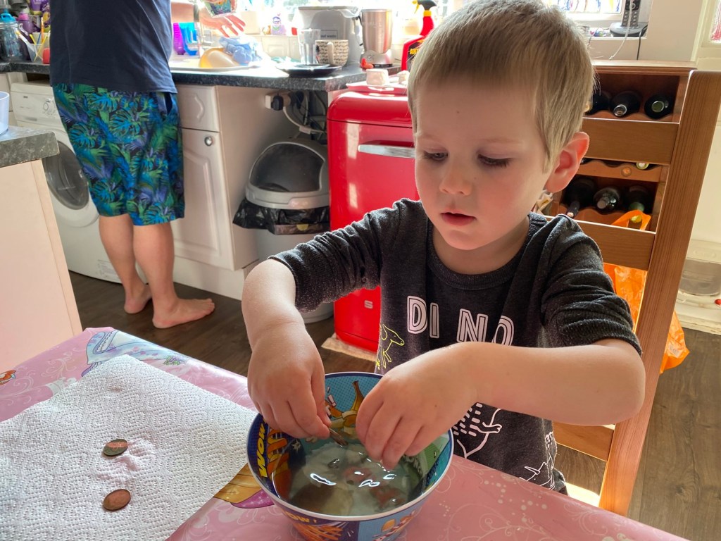 While we were sorting the Lego, James discovered a very dirty 1p coin. This prompted Stephen to get the kids involved in a “science experiment” using HP sauce to clean them. Super cute watching them hanging on his every word. They are really missing their daddy at the moment. He’s obviously home and is trying doing things with them, but he’s so wiped out that it’s not the usual daddy/children interaction and they’re very aware of that.