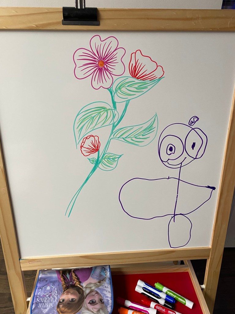 While Genevieve was “busy” working, James drew the mouse from the Gruffalo with some help from Megan. He also did an amazing self portrait on the whiteboard (beautifully juxtaposed by Megan’s flower picture). He’s really confident with a pen but needs to work on his grip – currently he holds pens and pencils like a spear rather than the usual finger and thumb option. He’ll get there though and it’s definitely not holding him back creatively!