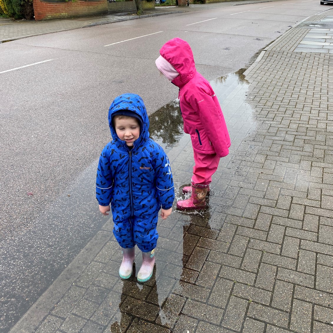 On the way back from the bakery the kids took every opportunity to splash and jump in puddles. Despite wearing wellies and puddle suits, they still managed to arrive home with cold and wet feet and legs. A quick change of clothes and warm sausage rolls sorted them out soon enough though.