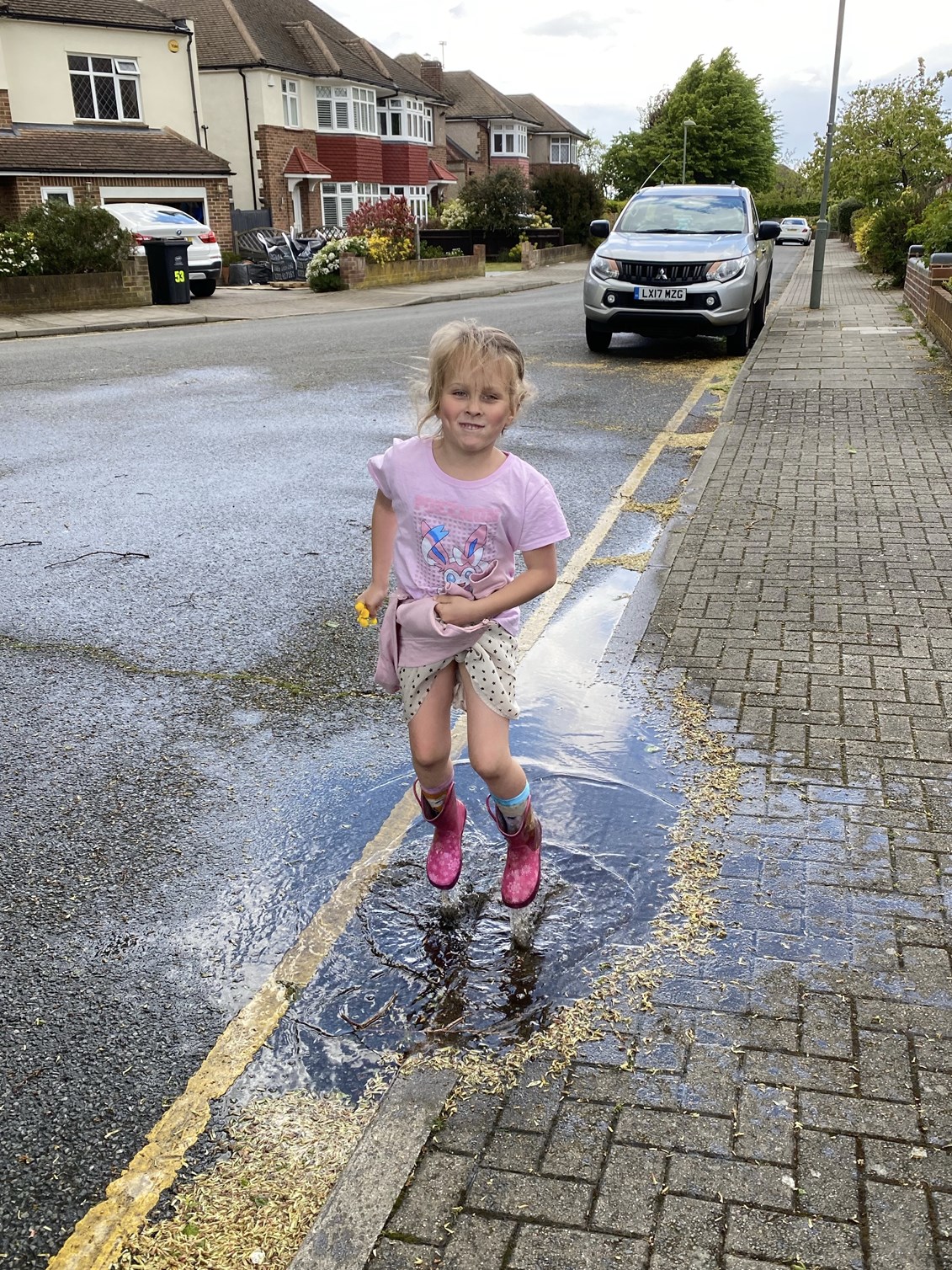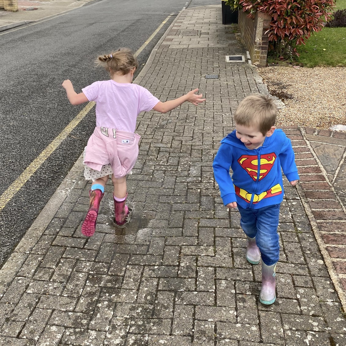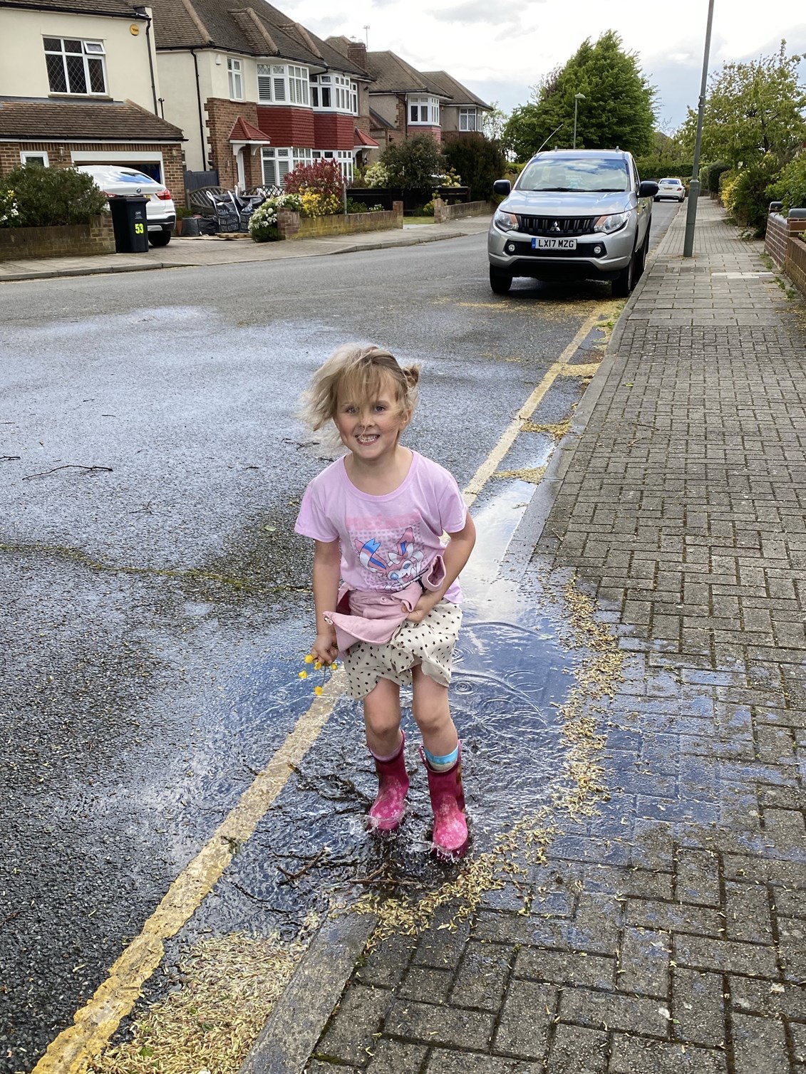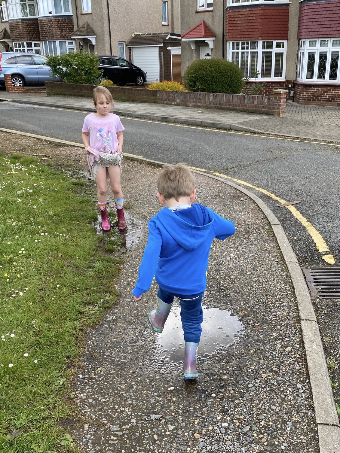 By the time Genevieve was finished, the rain had stopped and the sun was shining so Megan took the kids out to jump in puddles. They had a lot of fun. Like a huge amount of enjoyment. They must have jumped in every puddle on the block plus all the other nearby puddles for good measure. There can’t have been a single puddle within a kilometre that hadn’t been splashed or frolicked in. You get the idea.