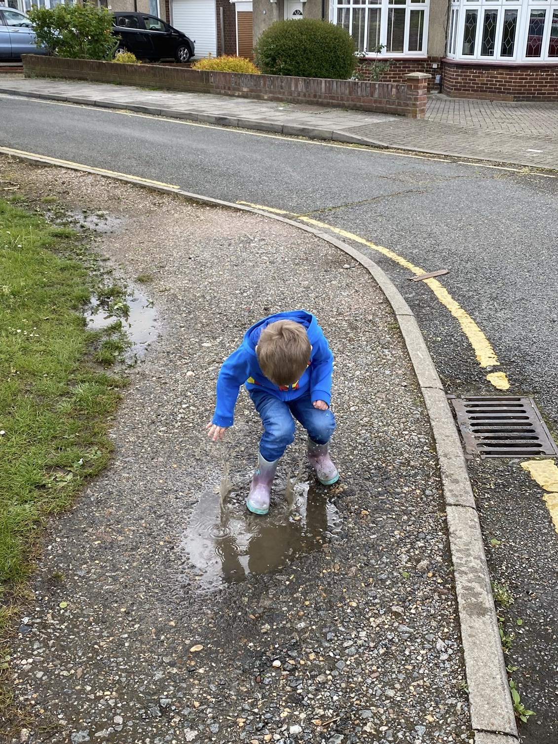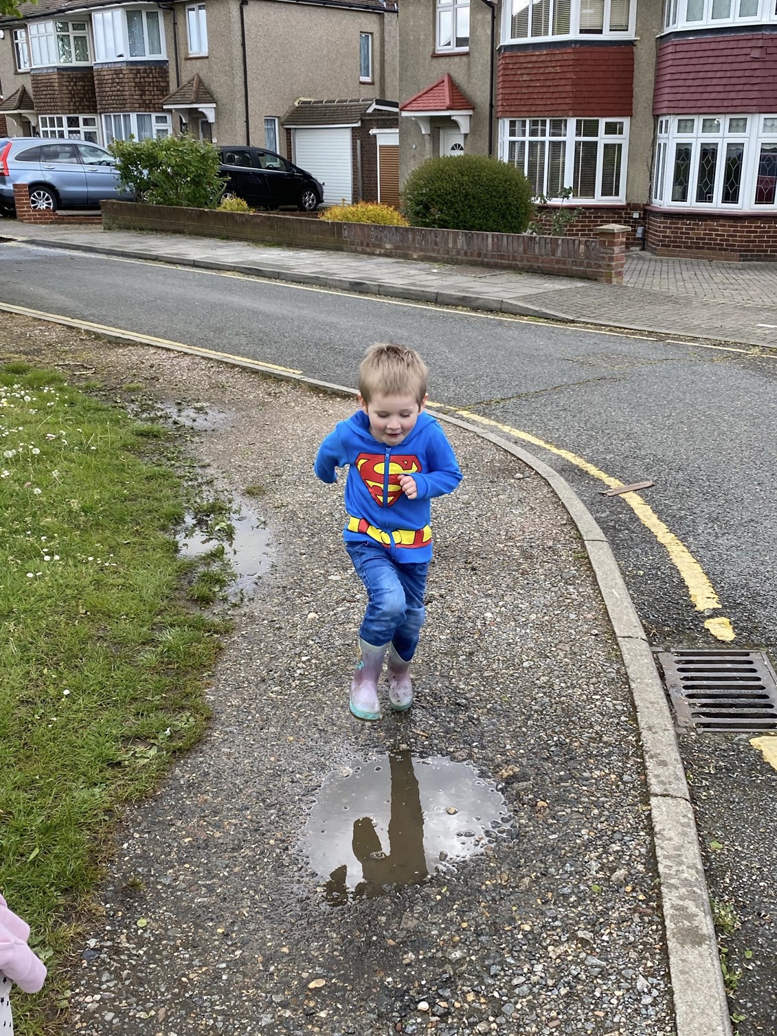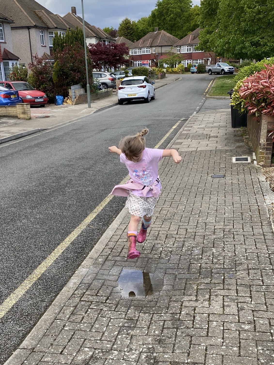 By the time Genevieve was finished, the rain had stopped and the sun was shining so Megan took the kids out to jump in puddles. They had a lot of fun. Like a huge amount of enjoyment. They must have jumped in every puddle on the block plus all the other nearby puddles for good measure. There can’t have been a single puddle within a kilometre that hadn’t been splashed or frolicked in. You get the idea.