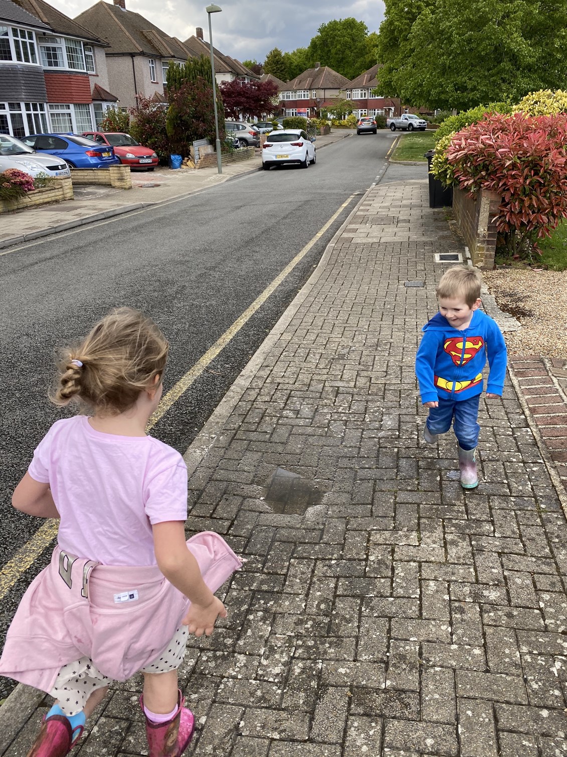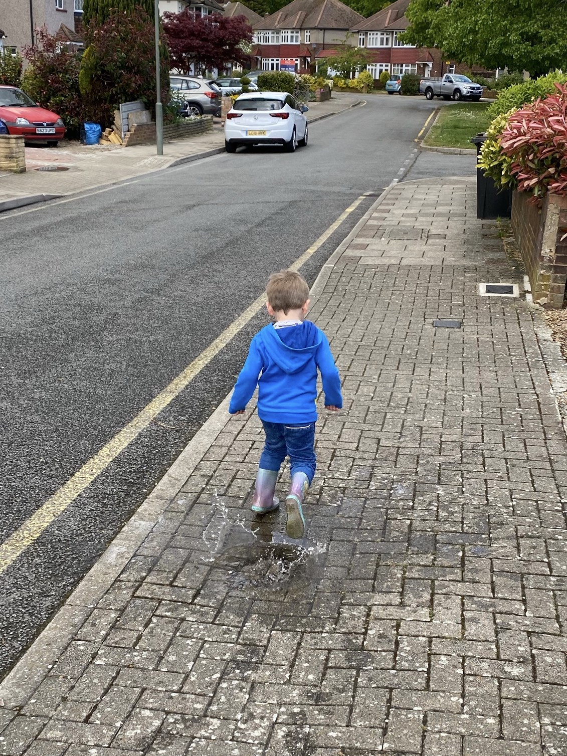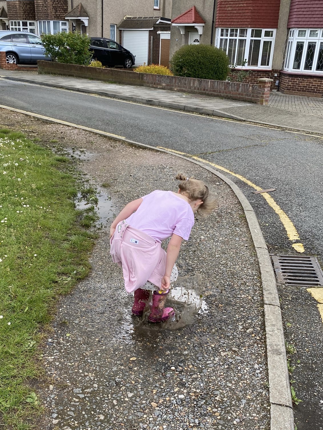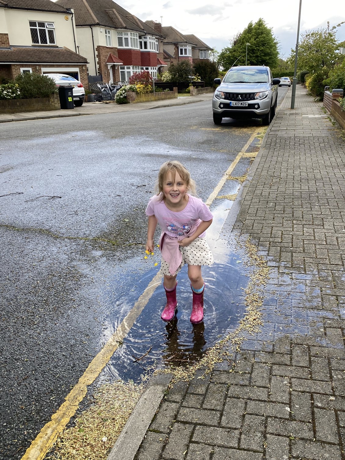 By the time Genevieve was finished, the rain had stopped and the sun was shining so Megan took the kids out to jump in puddles. They had a lot of fun. Like a huge amount of enjoyment. They must have jumped in every puddle on the block plus all the other nearby puddles for good measure. There can’t have been a single puddle within a kilometre that hadn’t been splashed or frolicked in. You get the idea.