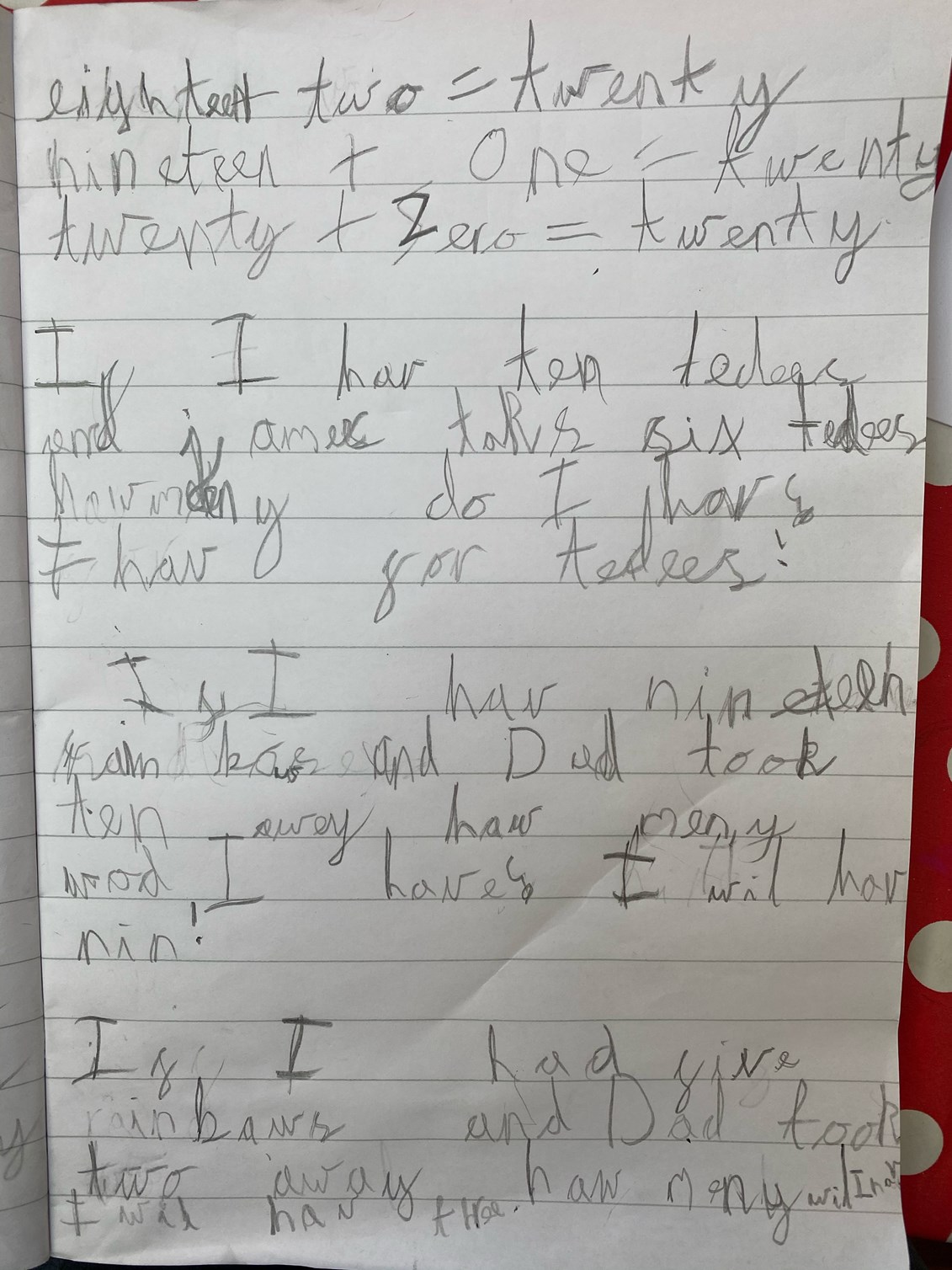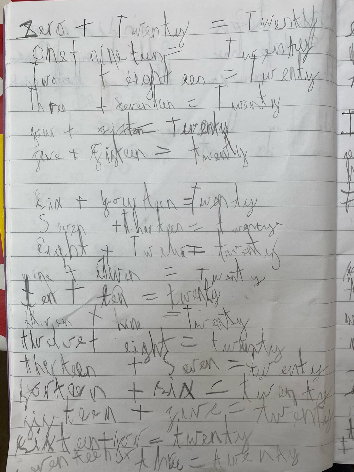 Getting Genevieve to finish the last of her school work for the week was nearly impossible. All she had to do was write out the number bonds for twenty (zero plus twenty equals twenty, one plus nineteen equals twenty and so on) and then make up three real-world sums (e.g. if I had eight bananas and my brother took two how many would I have left). It should have taken around half an hour (at most) but was dragged out for well over four hours in the end. Megan and I tried various different negotiation styles, approaches and threats to get her to finish. Although we got there in the end we were hopeful that she’d come out of this difficult phase soon. She was more than capable of doing the work and, frankly, we were mentally frazzled from the constant battling.