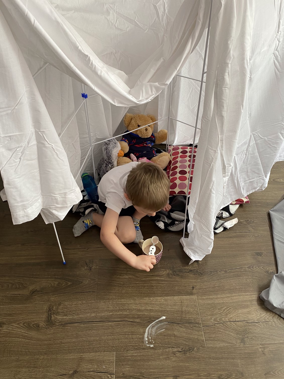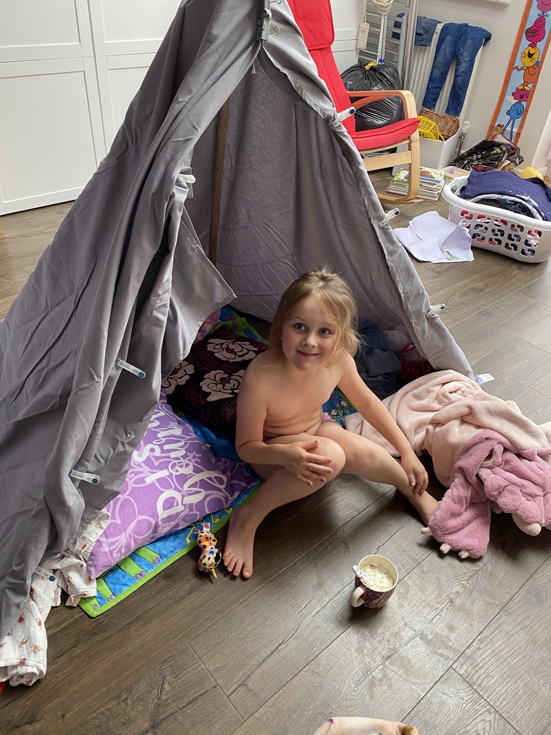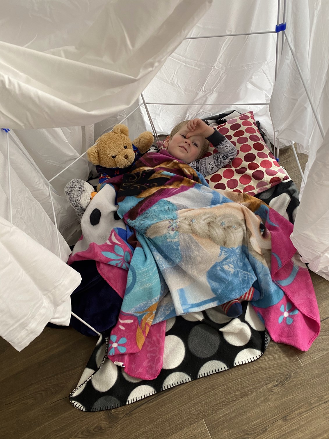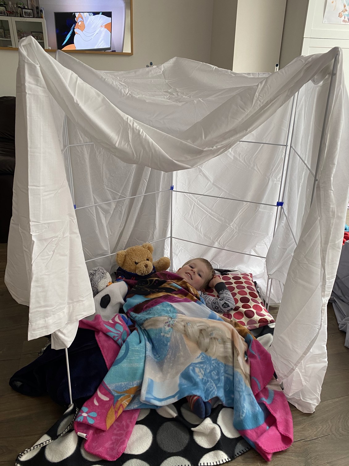 At this point I felt it was important to bring out the big guns with entertaining the kids so we built dens with some special den building sheets I had purchased at the start of lockdown. I had been promising to do this with them for a while so they were most excited when the dens finally went up. They each had a pillow and blanket in their dens so were happy to curl up watching The Little Mermaid thanks to Disney+!