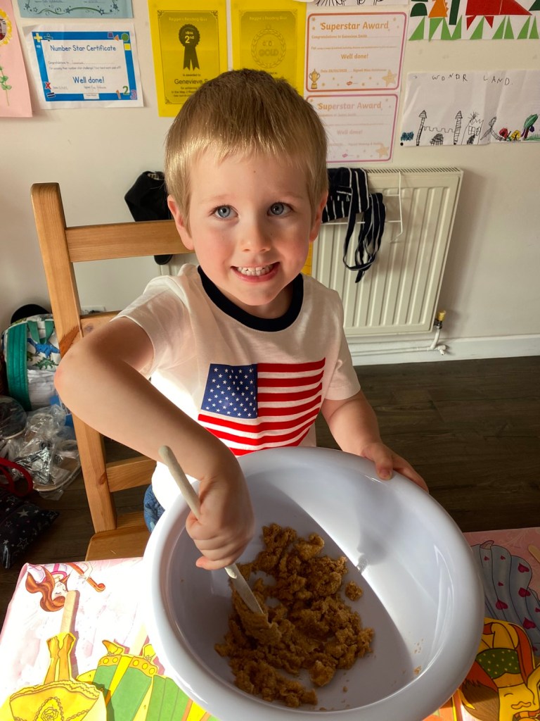 I had an urge for cookie dough so the children “helped” me knock up a batch of peanut butter and chocolate chip cookie dough. They were both “so tired” after three seconds of mixing so I ended up doing most of it, but they were excited to see (and definitely to try) the finished product.