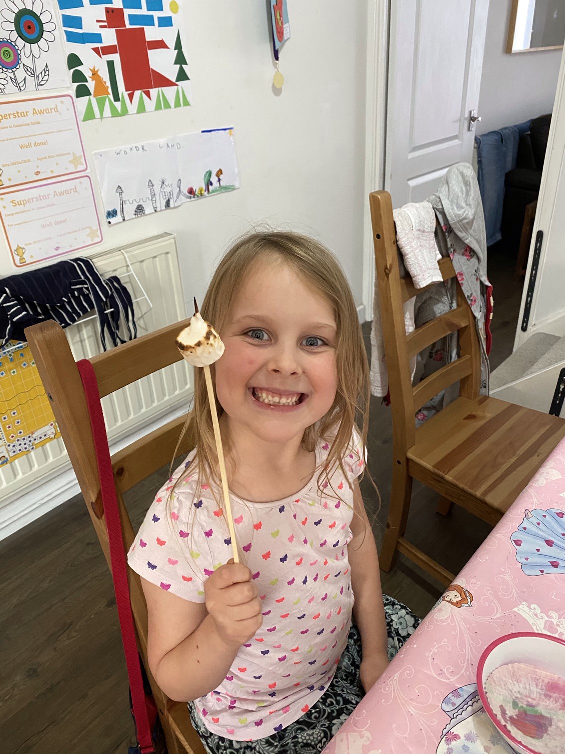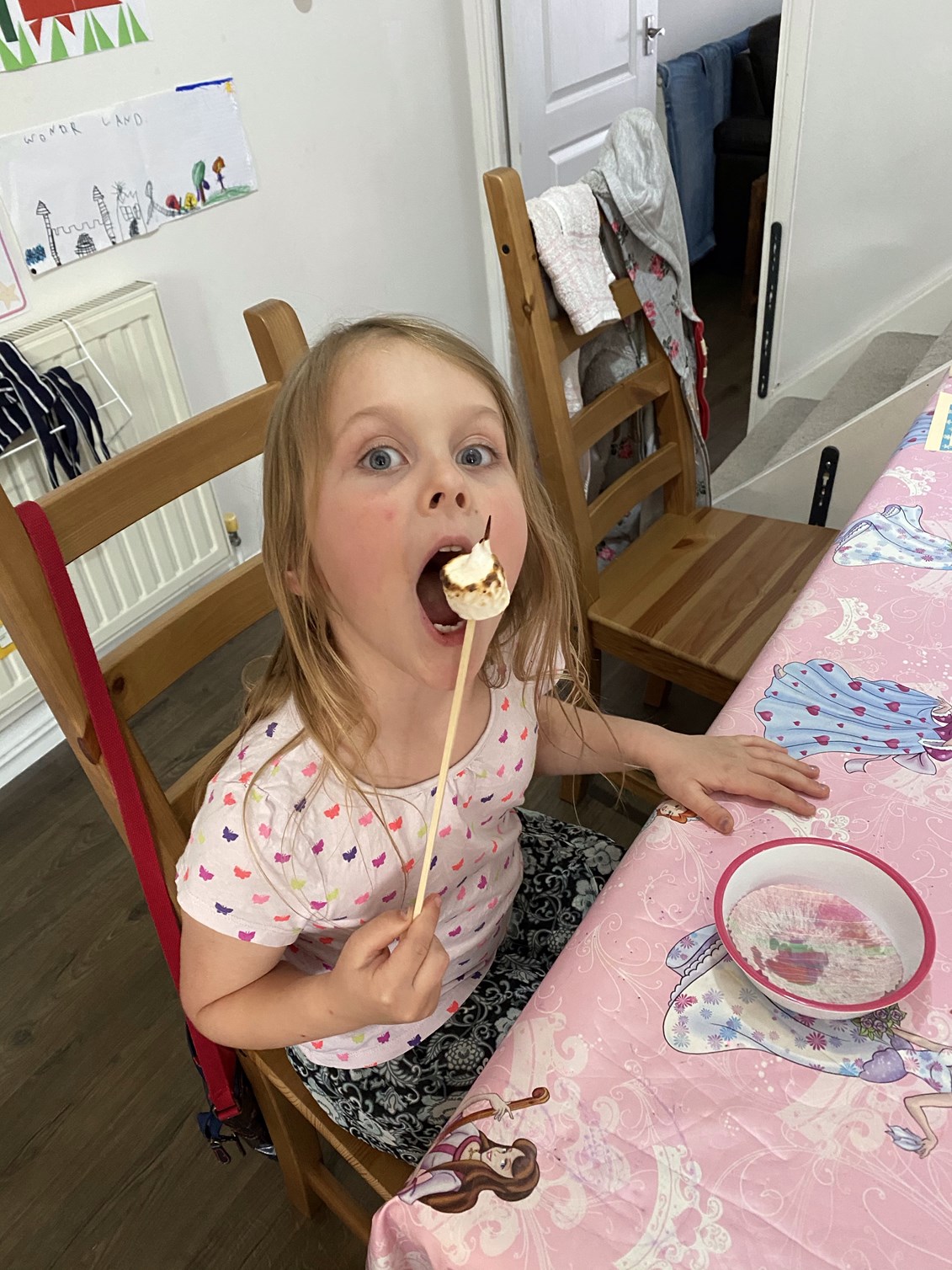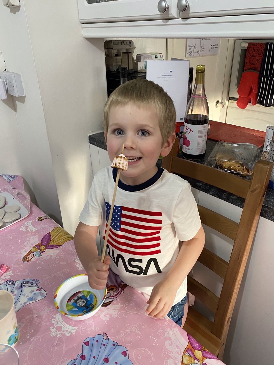 We had a camping adventure planned for the evening so dinner started normally (burgers and chips) but ended with toasted marshmallows. What a treat! We had planned to toast them on an actual fire, but Stephen made do with the gas burners on the hob instead.