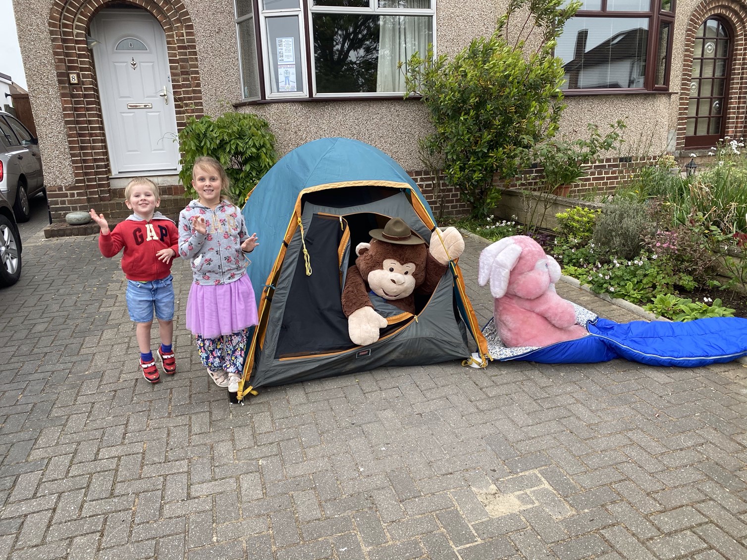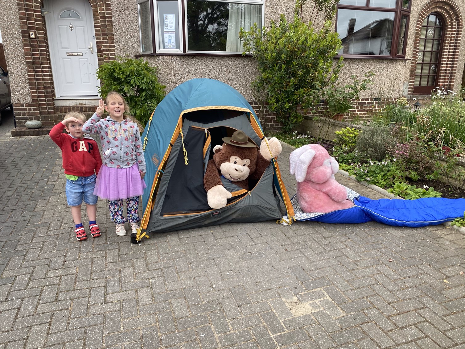 After said bingo chat, me and the kids managed to pop up to see what the friendly neighbourhood monkey was doing today before he got rained on. He was also camping – he must have heard how much fun the children had had!