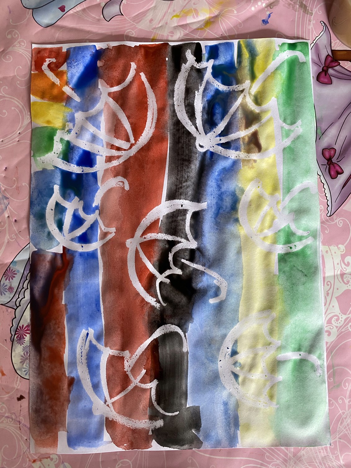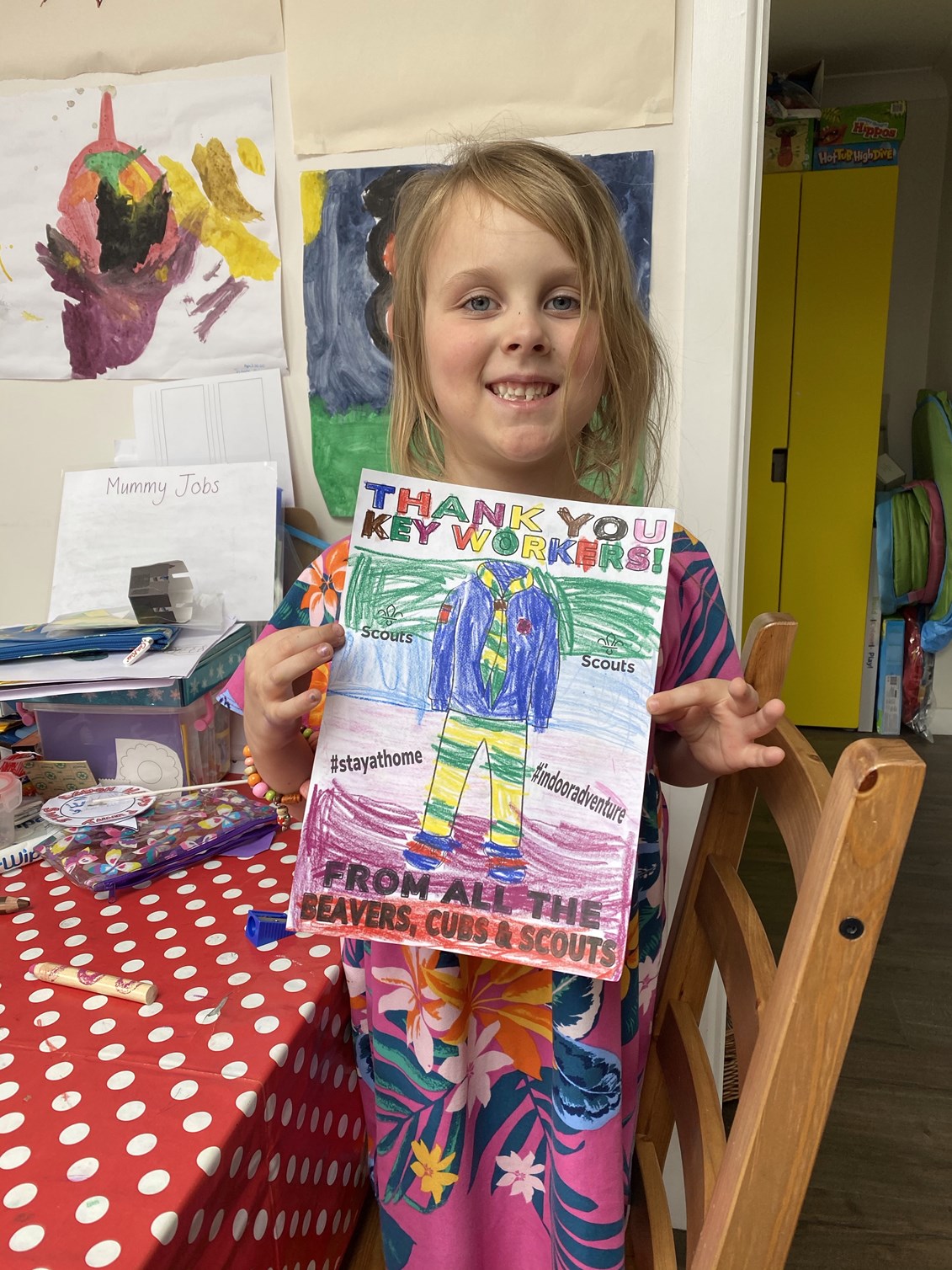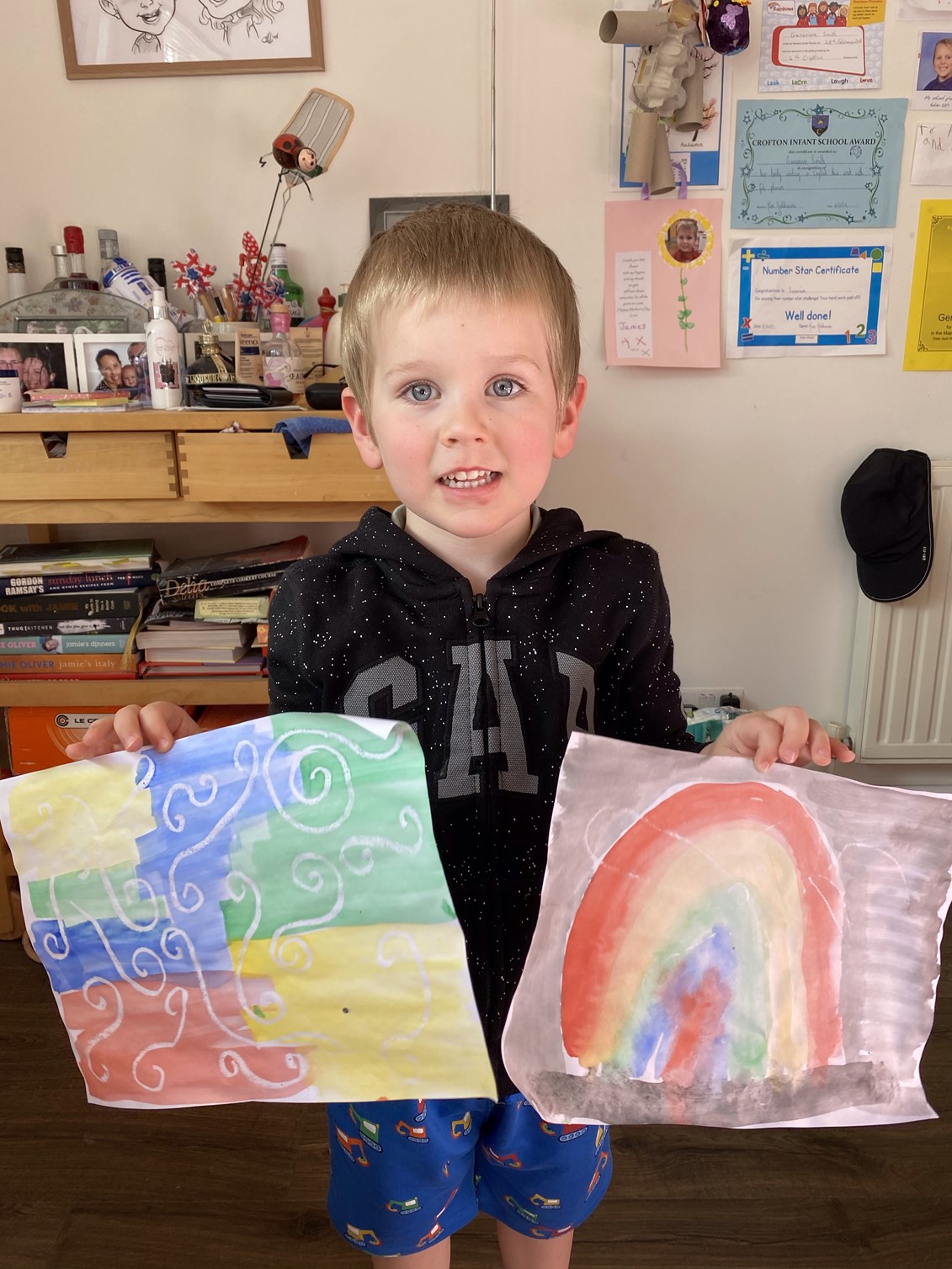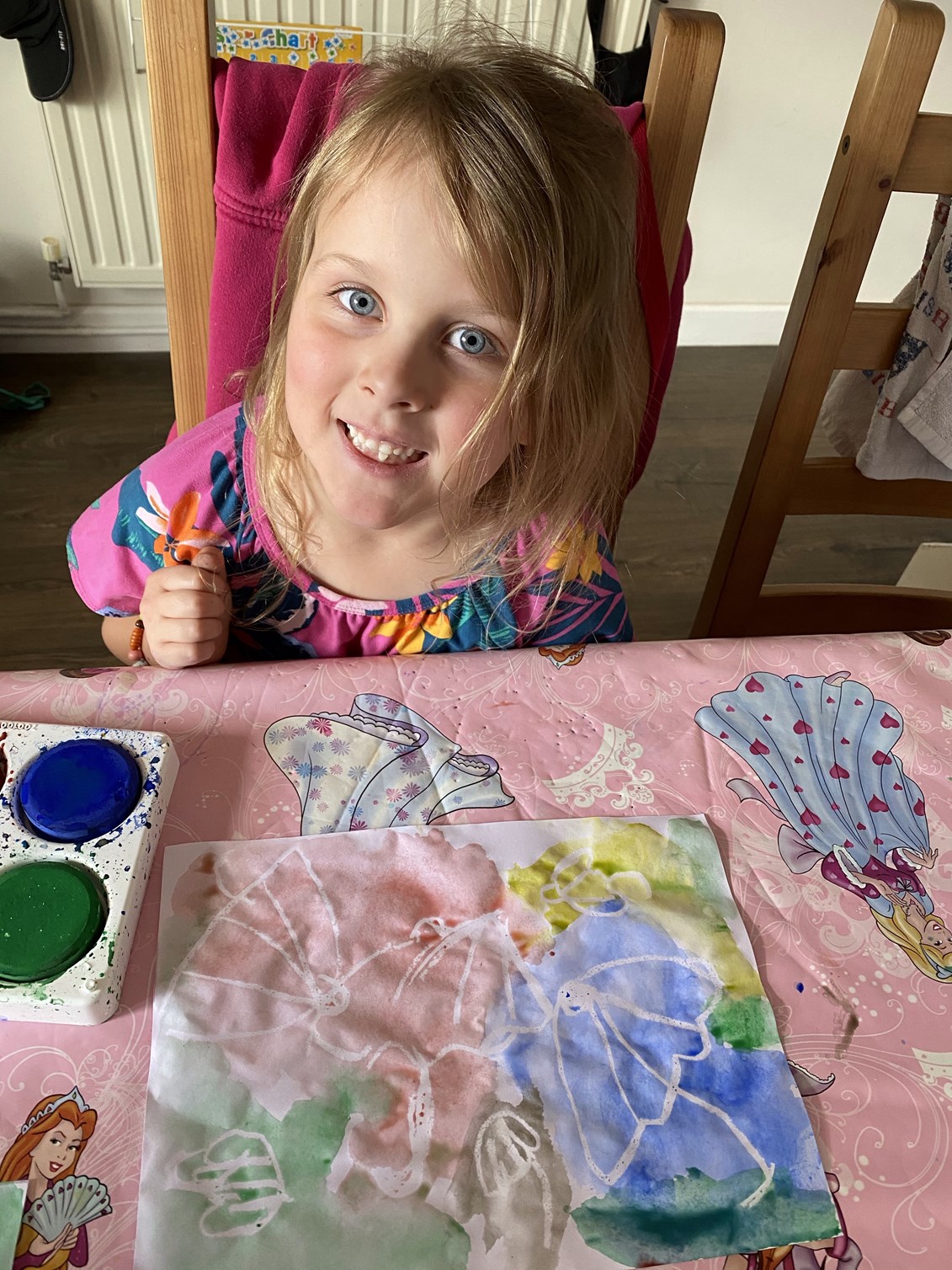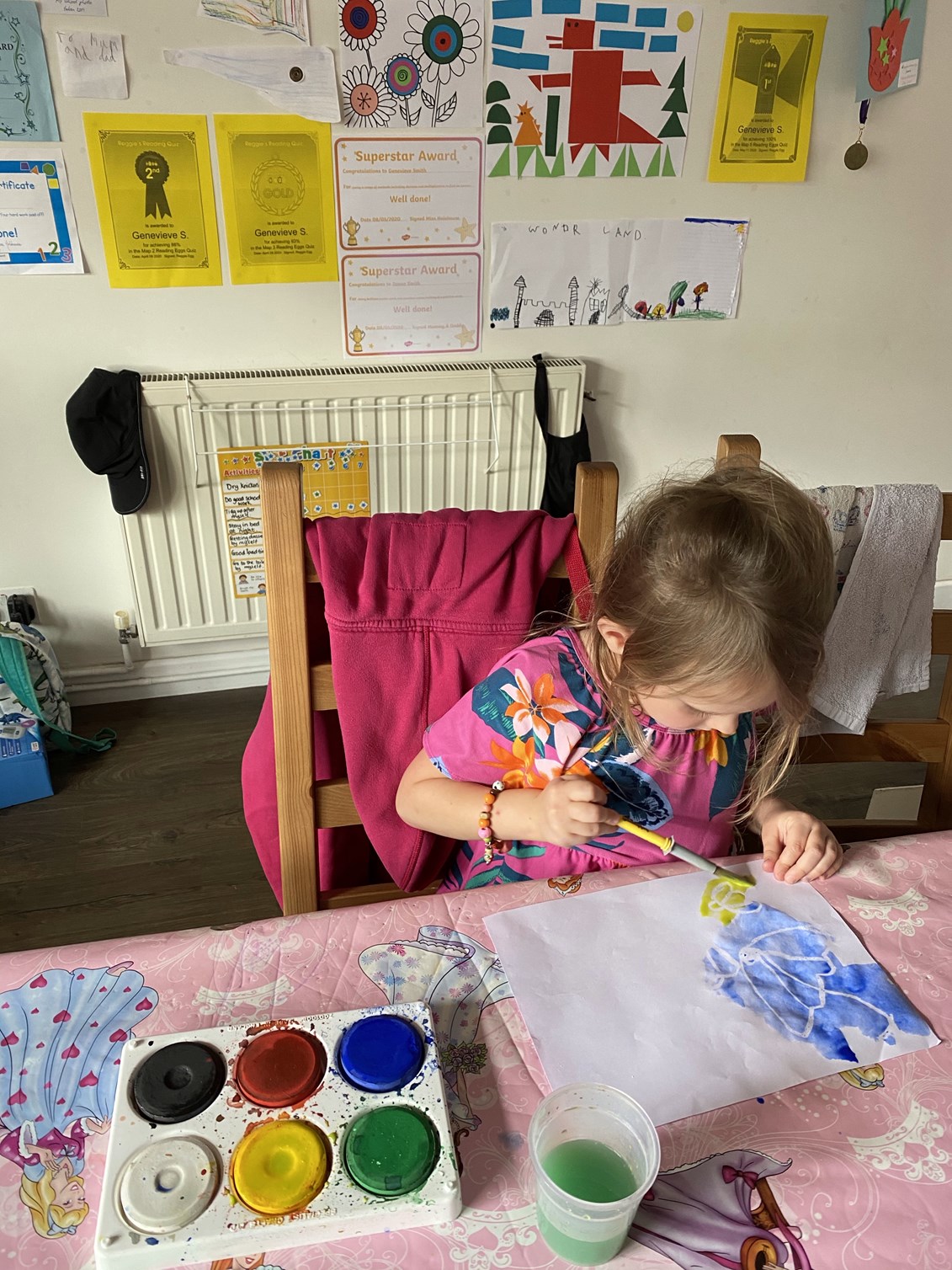 We got back home and Genevieve did her Beaver challenge for the week – a Scouting colouring sheet for key workers and a labelled a map of the British Isles. She actually wanted to do this so it was easy for once. It also inspired us to do another challenge – some Indonesian wax resist paintings. We took the idea from her coding challenge yesterday and she loved it. James wanted to get involved too, of course. It was fine while they weren’t arguing over the paintbrushes, but that didn’t last very long. It’s fairly standard to have at least one argument during any activity at the moment. The pictures looked fantastic though.