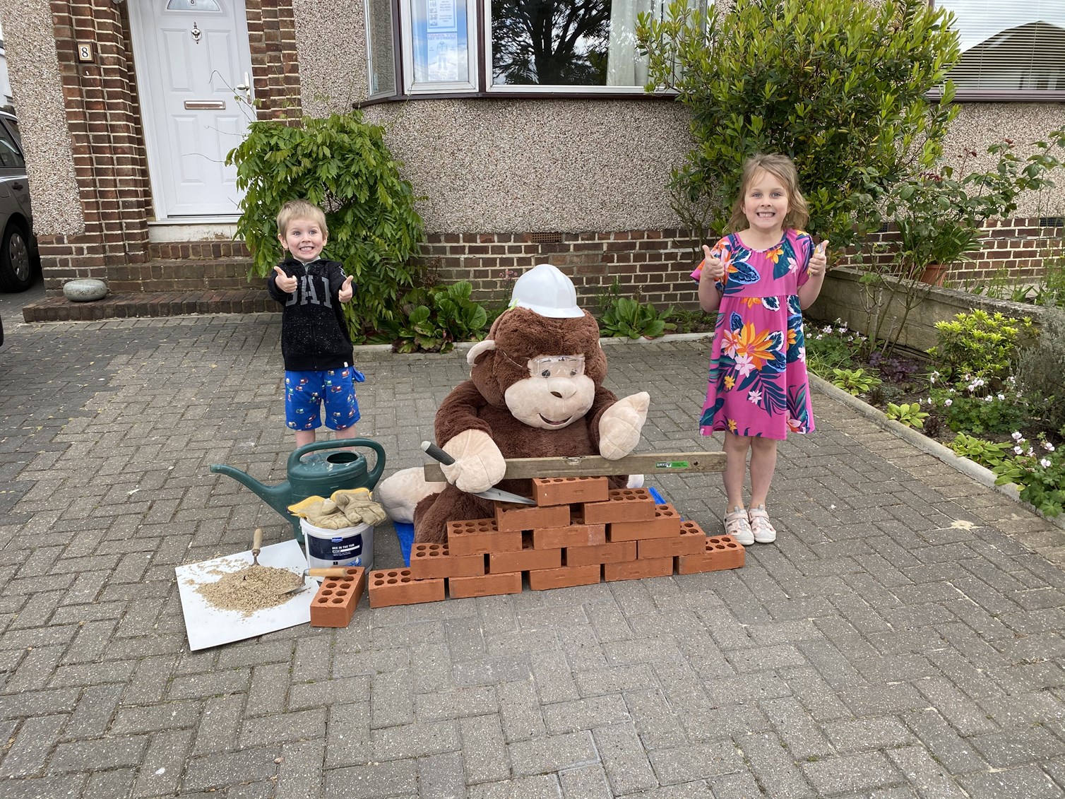 Once I was back from my run I took the kids out to see the friendly neighbourhood monkey. Today he was building a brick wall on his driveway. Where will they park their car now?!
