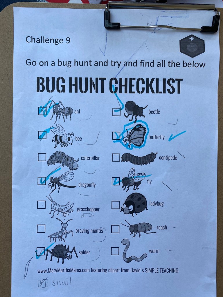 Once dressed, we wandered up to the green to undertake a bug hunt as part of one of Genevieve’s Beaver badges. James definitely helped, although there were some arguments about who’d found which bug first. The kids were quite cautious about getting near bees and both shrieked when they found a spider, but otherwise it was a very successful hunt.
