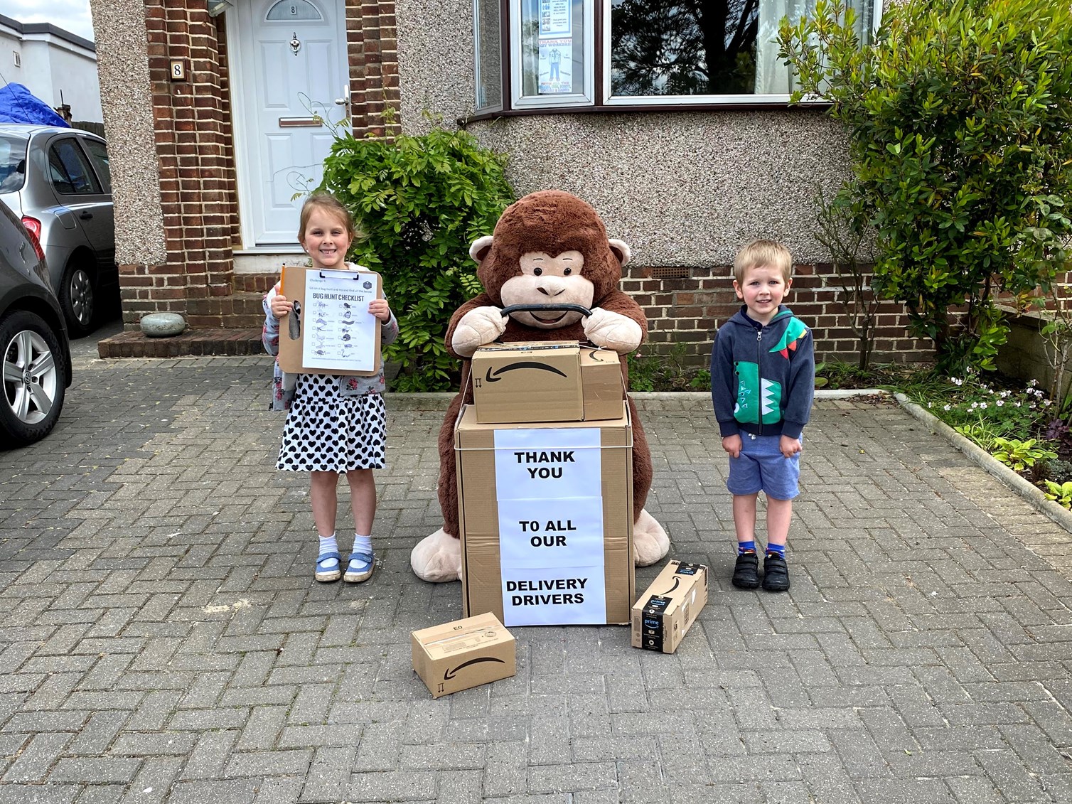 Stephen quickly got tired to headed home for a sleep while the three of us went for a walk around the local streets. We wandered past the friendly neighbourhood monkey who was a delivery man today. He had a lovely thank you note for all the delivery people still working.