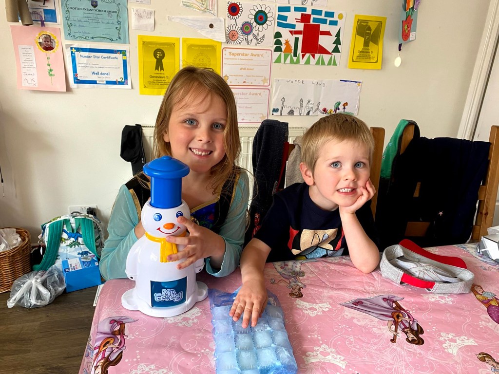 When Stephen woke up I dug the Mr Frosty out of the cupboard. The kids had seen it when I was cleaning the other day and have been bugging us about it ever since. It was a lot of hard work to get a minuscule amount of shaved ice out (certainly nowhere near as easy as the adverts make it look), and the handle felt like it was about to snap off at any second. So, we ended up cheating and just blitzed some ice in the blender. Winning!
