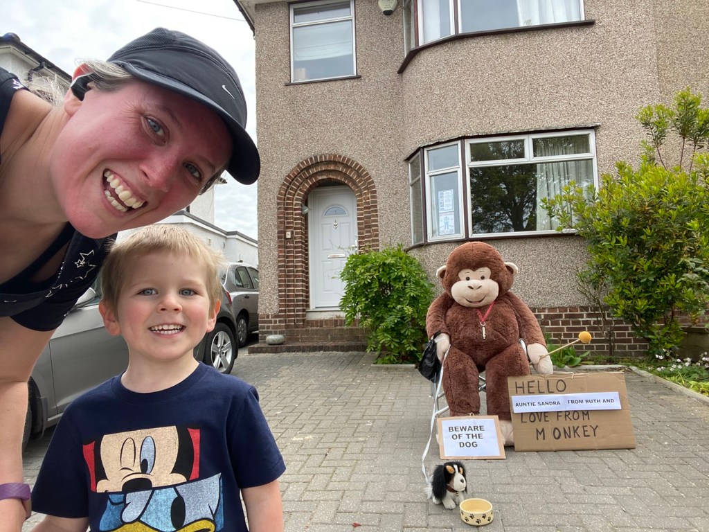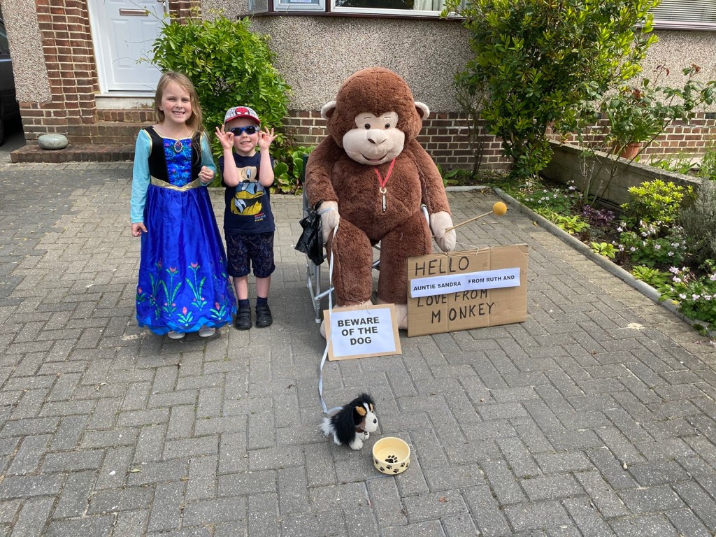 Stephen went for a sleep so the kids and I took a slice of cake over to my friend Gemma (who was very grateful) and then went for a quick walk to check on the friendly neighbourhood monkey. Today he was walking his dog (who I was glad to see was on a lead – even toy monkeys need to follow lockdown guidance!).