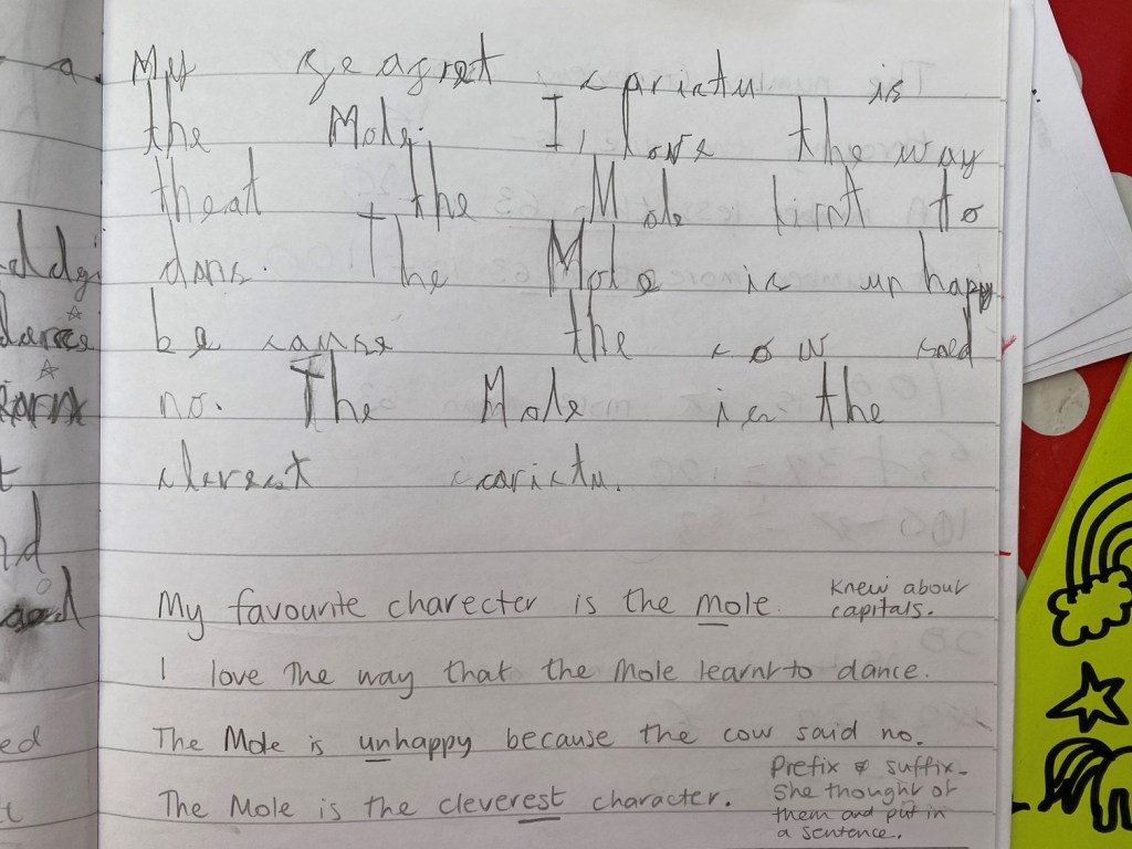 We set about trying to write a short story about Genevieve’s favourite character from this week’s book – the mole. It was just like pulling teeth all over again. Like she had never been away. But she did it. And I worked out that if we talk through and then I write down the sentences before she then writes them down then she was more amenable to getting it done.