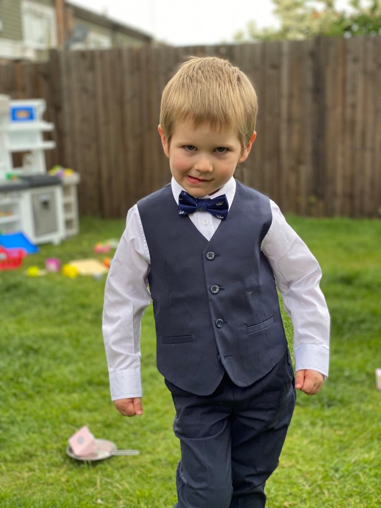Whilst Daisy and Ben were here, James tried on his outfit for their wedding. He looks amazing in it. So smart and so grown up!