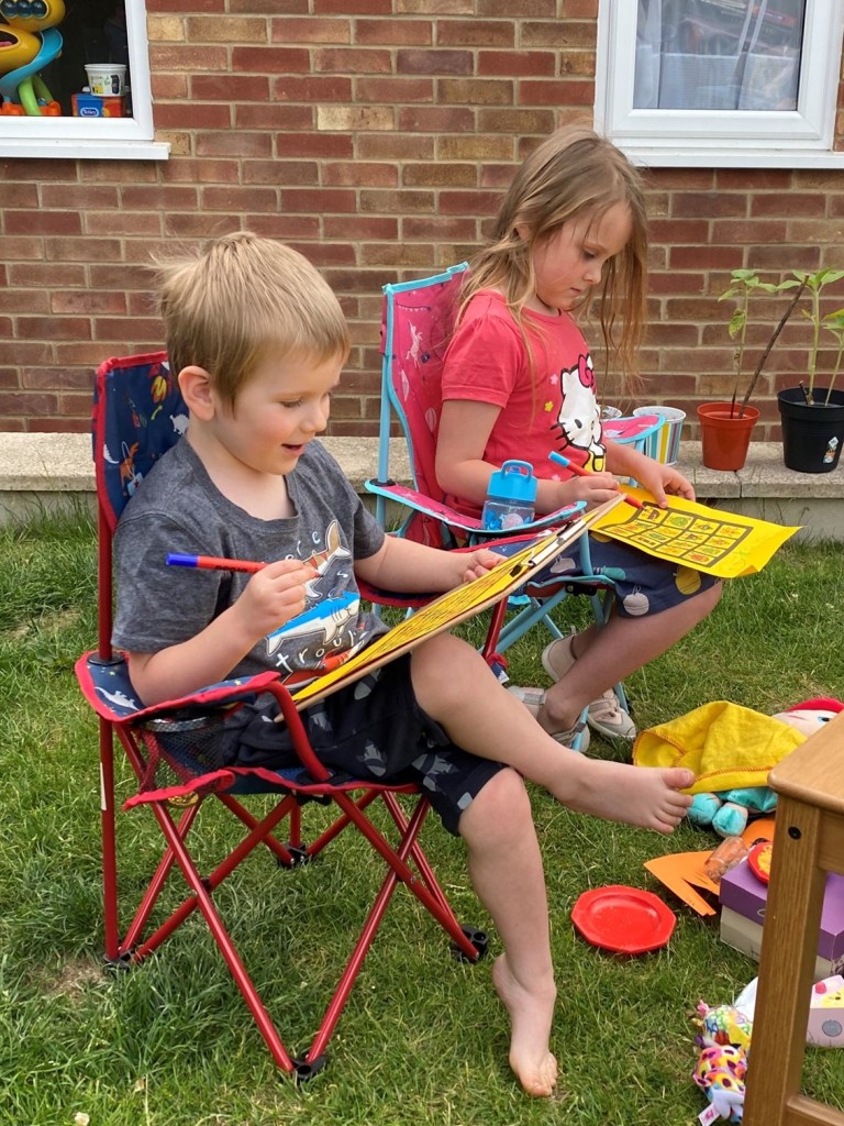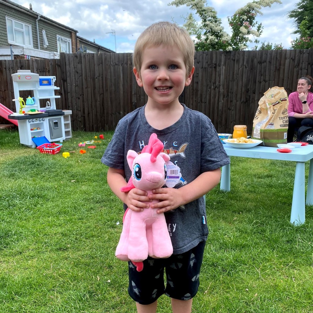 Daisy and Ben also brought a cuddly toy for James. It was one Daisy had won when we’d all been to Hastings in January. James had fallen in love with it at the time and was so happy to be reunited. Thank you Daisy! The toy pony was named Pinky Pie and soon joined the ranks of other teddies in the garden.