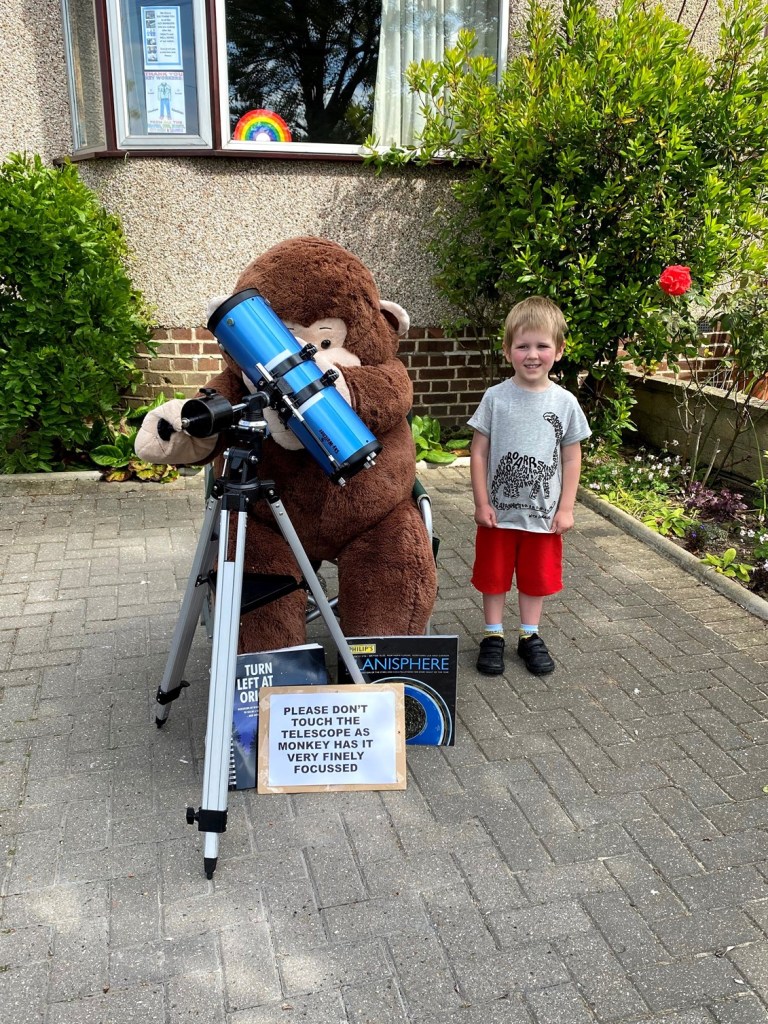 As it was just me and James, I made a special point of coming home via the train bridge. James still loves waving at the drivers! We also popped up to see the friendly neighbourhood monkey. Today he was stargazing.