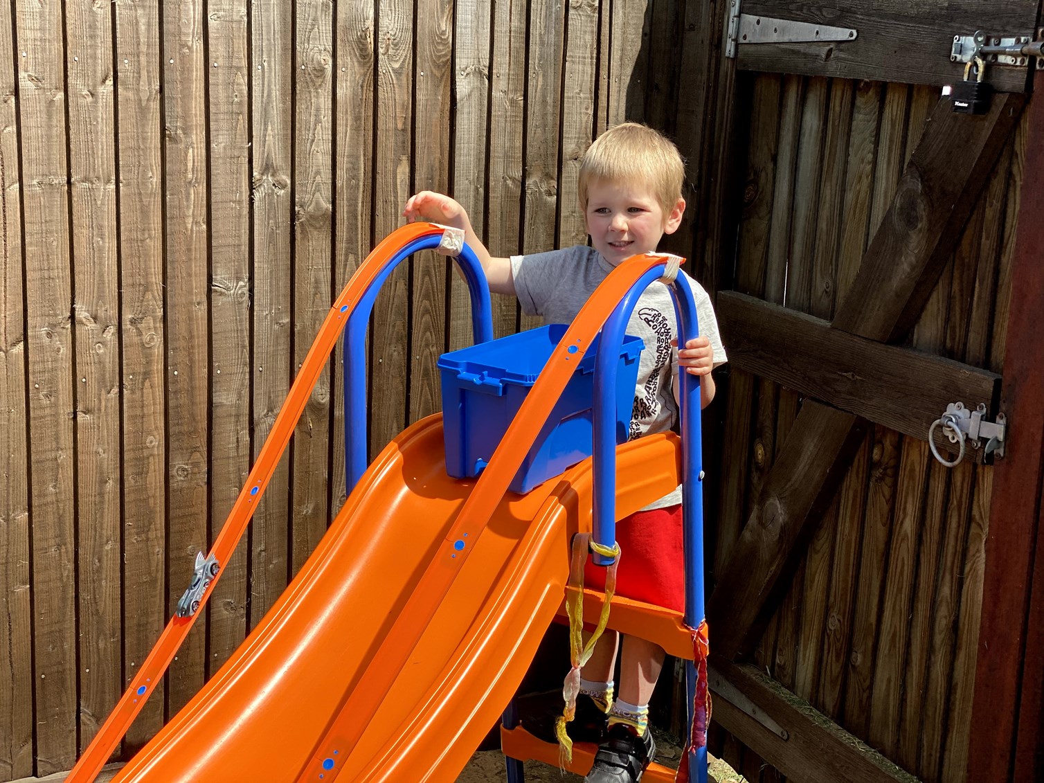 I got home and sorted out the food shopping. I’m getting really good at fridge and freezer Tetris (i.e. squeezing in the assorted shaped blocks in the most optimal fashion). As I was doing this, Stephen got the Hot Wheels ramps out in the garden with James. Super fun, especially when the ramp starts at the top of the slide. Weeeeeee!