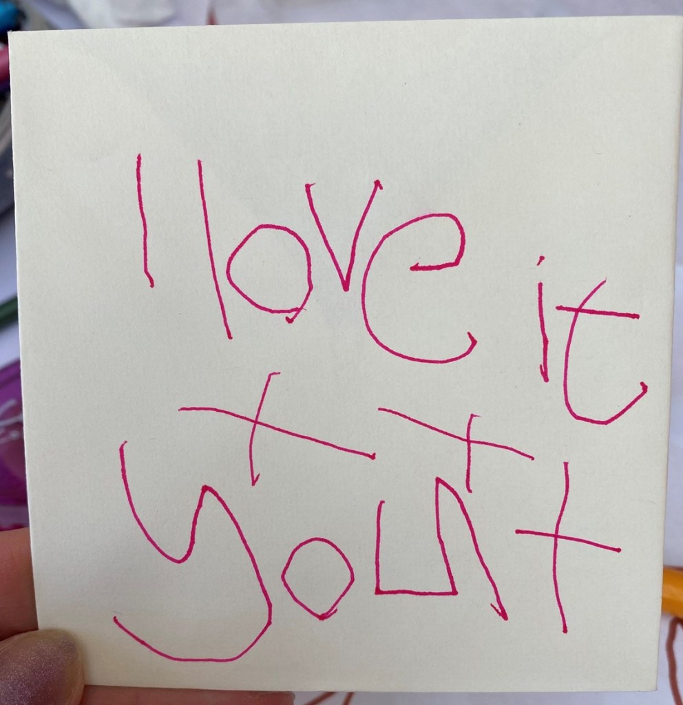 James wrote a lovely message to Grandma Lindsey and Grandad Lawrie. It initially said “I love it” but he changed it to “I love you” with three kisses. He wrote it all by himself and was very proud of his work (and rightly so).