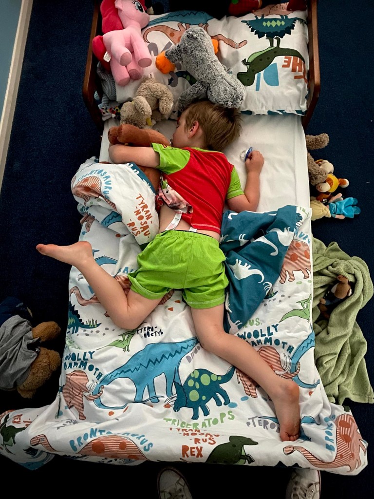 I checked in on the kids before I went to sleep. James was clearly sleeping well as he was in the most unusual position. My legs hurt just looking at him!