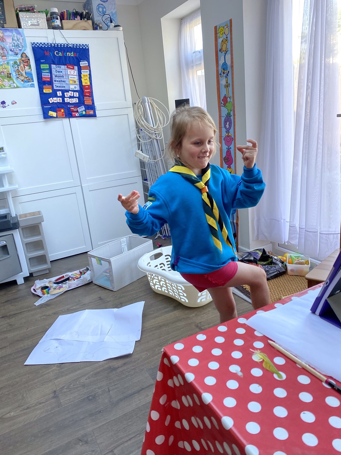 Once work was done, and I’d made the mini-booklets for Genevieve and James to do their schoolwork tomorrow, it was time for Genevieve to join her virtual Beavers meeting. She had been wearing a dress up until this point but swapped it for her Beaver jumper… which was fine until the Beavers all started dancing. The problem was that the quick change meant that Genevieve was only wearing knickers on her lower half. Cue a frantic rush to get shorts on to protect her modesty! We’re living the Zoom dream.