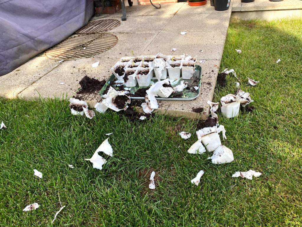 Stephen was sad to discover that some foxes had attacked the kids’ seedlings. Oh well. Hopefully the children won’t be too sad, and at least their sunflowers are still growing (as is the new turf I laid).
