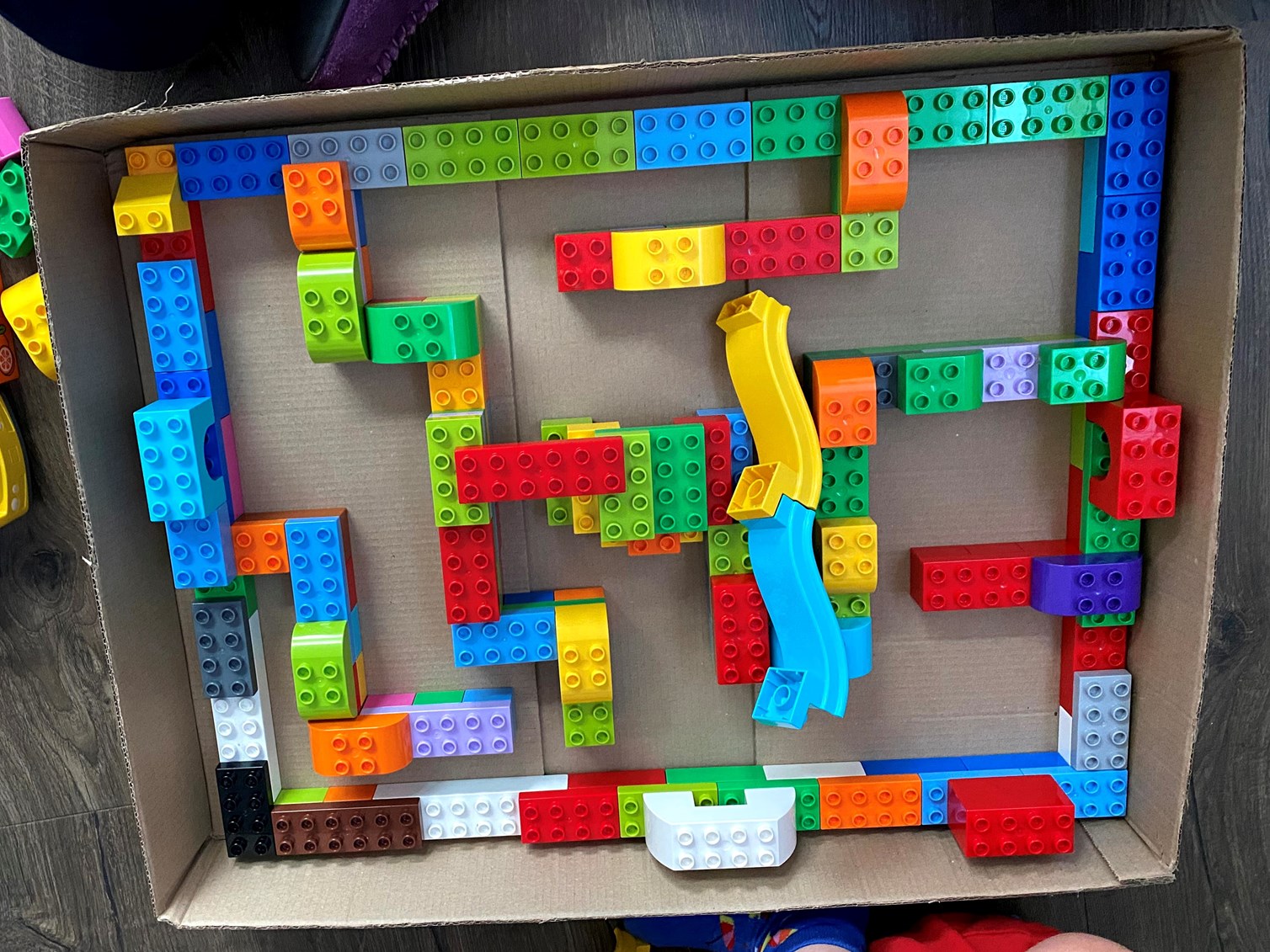 Having tidied up a bit, we made a maze out of Dulpo in a cardboard box. Once complete, he could then put his bouncy ball in and move towards the winning house in the middle!