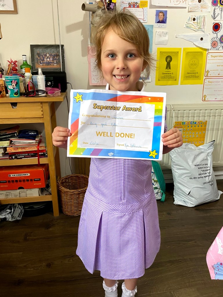 While sorting through Genevieve’s school bag I spotted a colourful piece of paper. She swiftly whisked it away from me and started to act very coy about it. It turned out that this was a ruse as she then burst out with the revelation that it was a certificate for “doing great maths”. Fantastic!
