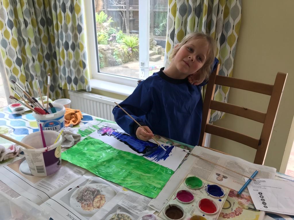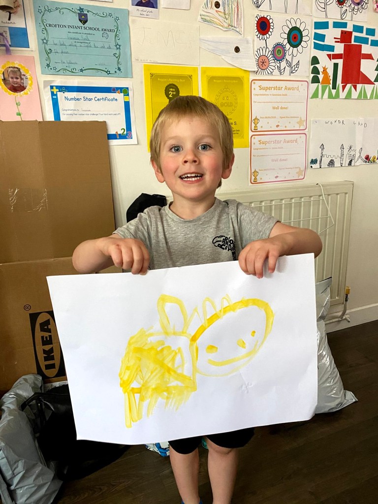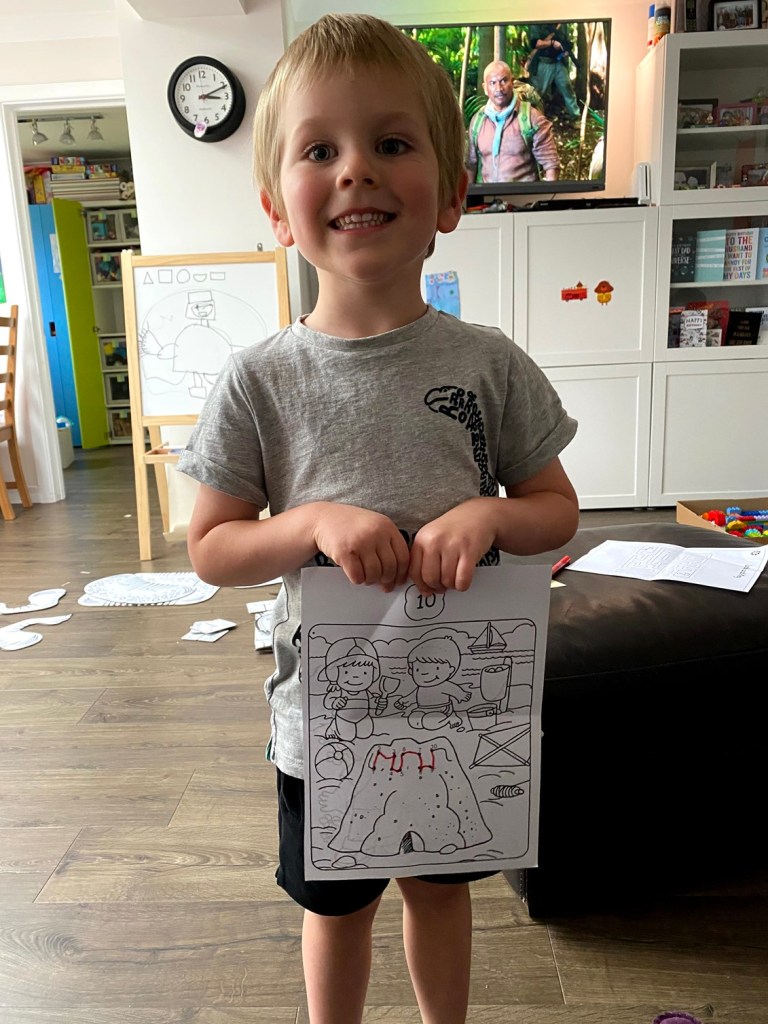 James was extremely excited to show off his artwork he’d competed with Grandma Lindsey and Grandad Lawrie. He was particularly pleased with his painting of a bee (even though he still runs a mile if a real one comes near him). He was proud of his dot-to-dot work too.