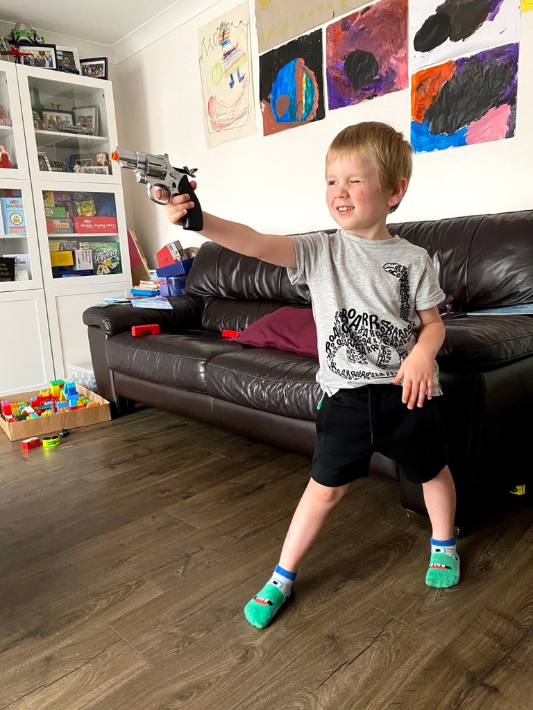 But the art appreciation was short-lived and James moved on to playing with his toy gun. He loves playing with it (despite Stephen and I doing very little to promote such play), but I guess that boys will be boys. He will need to work on his stance though if he wants to be more like Dirty Harry.