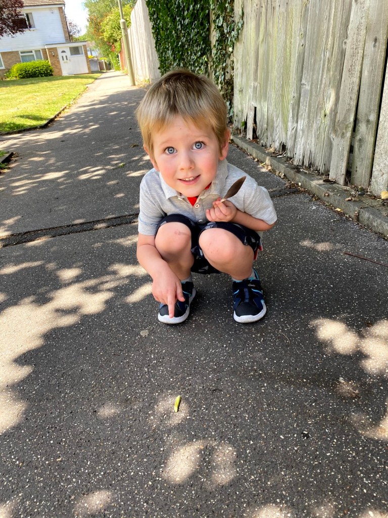 It was so nice to have a walk with Grandad. He joined in James’s game of “go and stop”, and entertained his (frankly awful) jokes. We then had an adventure walking home down a new alleyway and through the woods. I don’t think I anticipated how long it would take to get home, especially with James stopping every 10 seconds to look for fish in the river. But we actually saw some fish and he loved it! Then on the path of the home stretch we also found a green caterpillar. He was a very happy chap!
