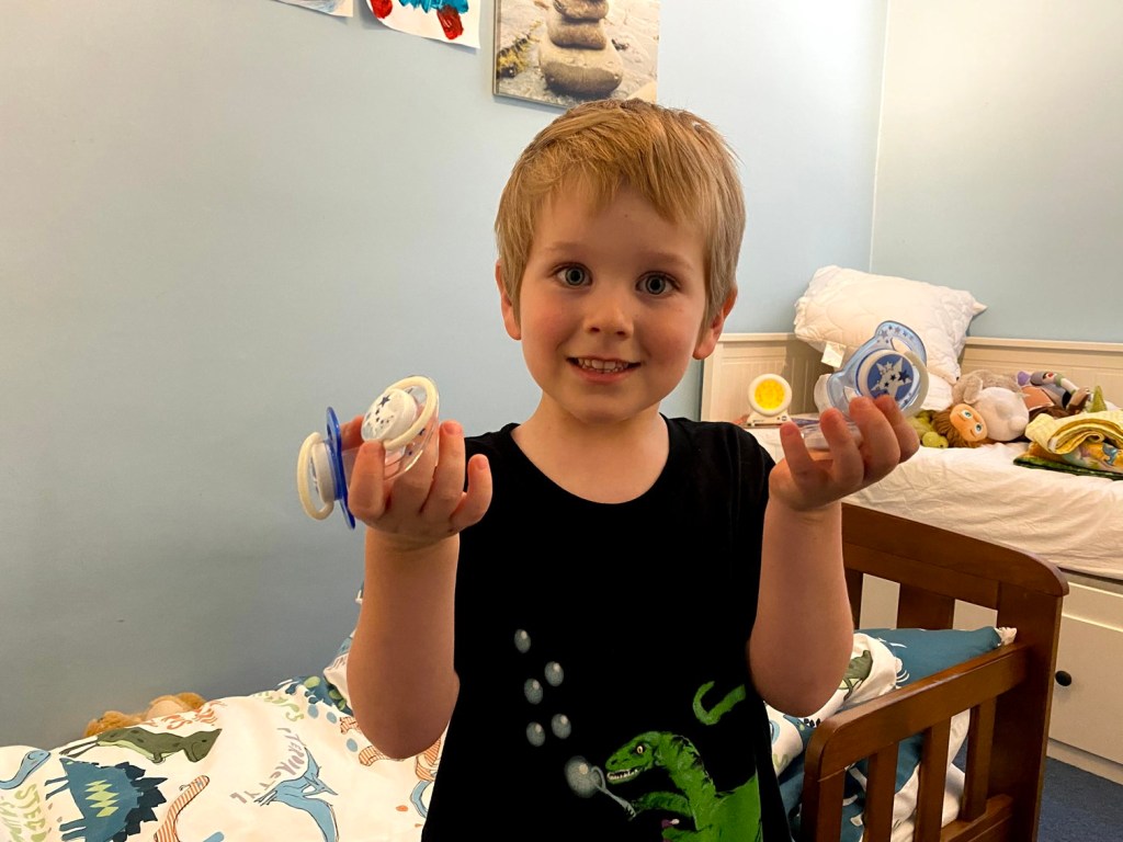 So this evening at bedtime, we tried the no dummies plan. He was fine at first, but after 45 minutes he was asking for them back. Bless him. He is now in bed with two out of four of his usual collection. So in my mind we are halfway there.