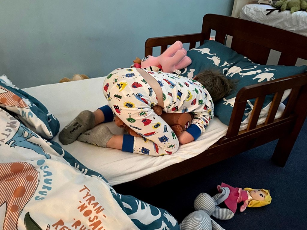 James, on the other hand, was dealt with by Stephen in the early hours, but he did go back to sleep for a bit. Stephen apparently found him like this. That can’t be comfortable!