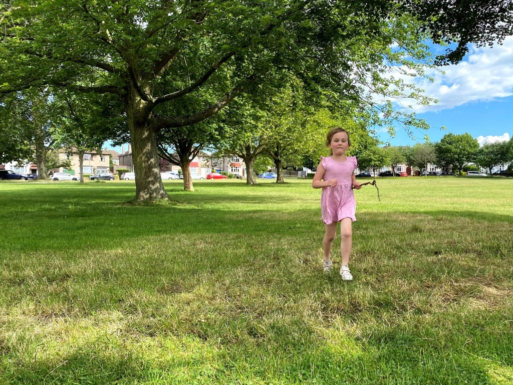 The kids then had a bit of a run around on the green while Stephen sat on a bench watching them collecting sticks. He desperately wants to run around and chase them but just can’t. He’ll get there soon though.