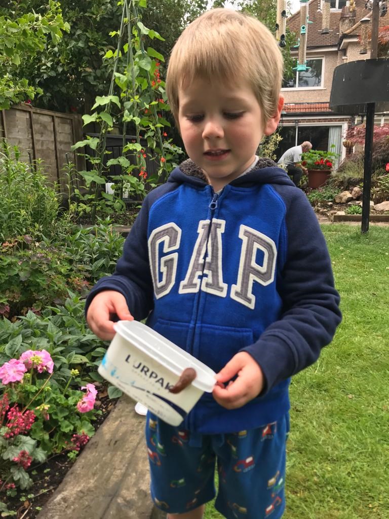 James soon got ‘cabin fever’, asked if he could go into the garden and then spent the next half an hour there collecting slugs and snails that were clearly enjoying the wet conditions (but maybe not the enthusiastic handling of a four year old).