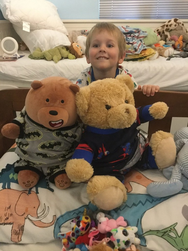 There was one thing that brightened the whole situation. James was delighted to discover that I’d dressed two of his teddies in some of his old pyjamas while he’d been out for the day. He was over the moon!