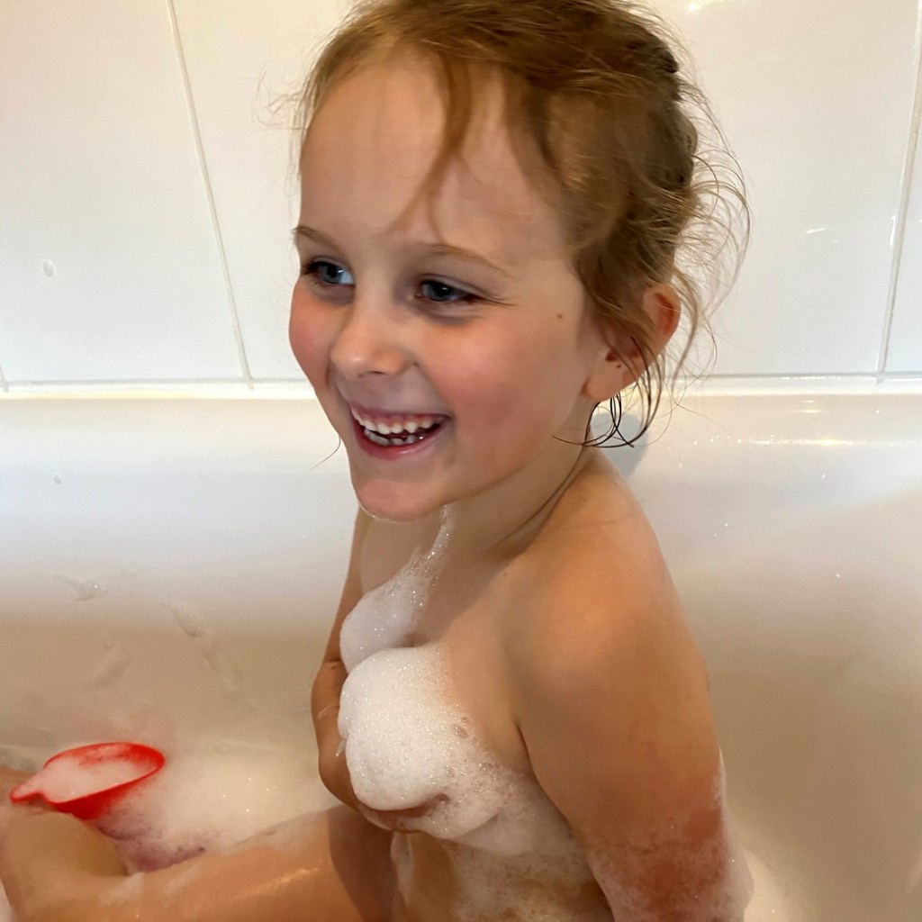 Once we’d got home it was time to clean her in the bath. Stephen had whisked up a mountain of bubbles with which Genevieve had great fun. The highlight was her announcing “look at my bubble boobs”. Needless to say she did a lot of laughing.