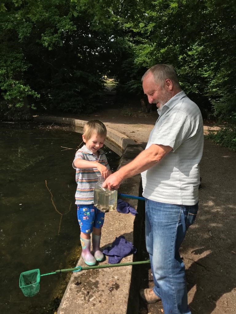 We spent over half an hour ‘fishing’ with our nets, with the most excitement caused when Grandad Lawrie caught a small tench (a little over two inches) in his net, followed shortly by three further tench of much smaller size. Other things caught included a number of newt tadpoles, an assortment of dragonfly and other larvae, a flotilla of small water boatmen and a single froglet with its tail still intact.