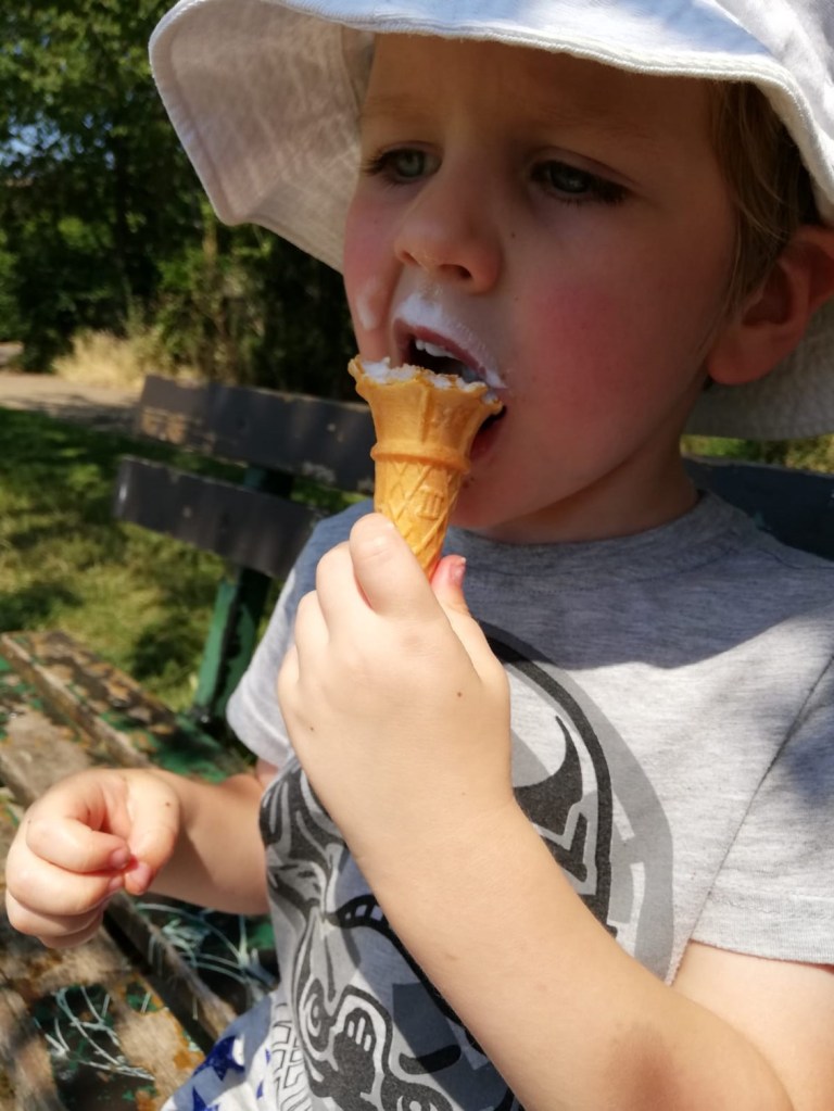 Grandma returns and remarkably the house hasn’t been flooded or burnt down. Lunch is another jam sandwich followed by a piece of pepper and strawberries. After lunch another check on the ice cream van in the park is called for.