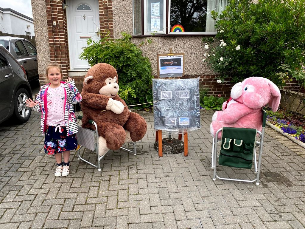 While I was tacking the sale, Stephen took Genevieve out for a walk and some “Daddy Genevieve” time. This started with a visit to the friendly neighbourhood monkey. Today he’d been giving a lecture about the giant asteroid that killed off the dinosaurs – very odd!