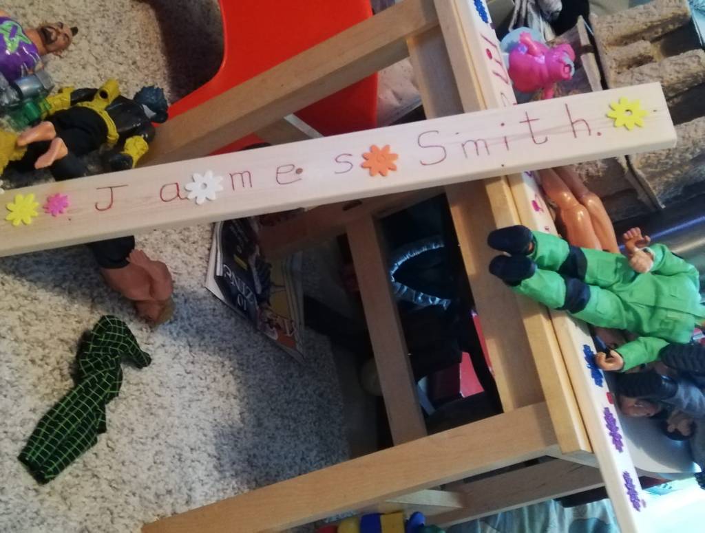 James also decorated a piece of wood with stickers and his name.