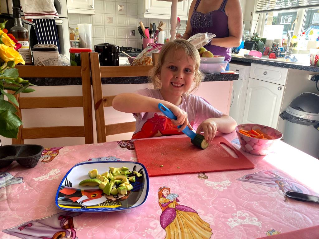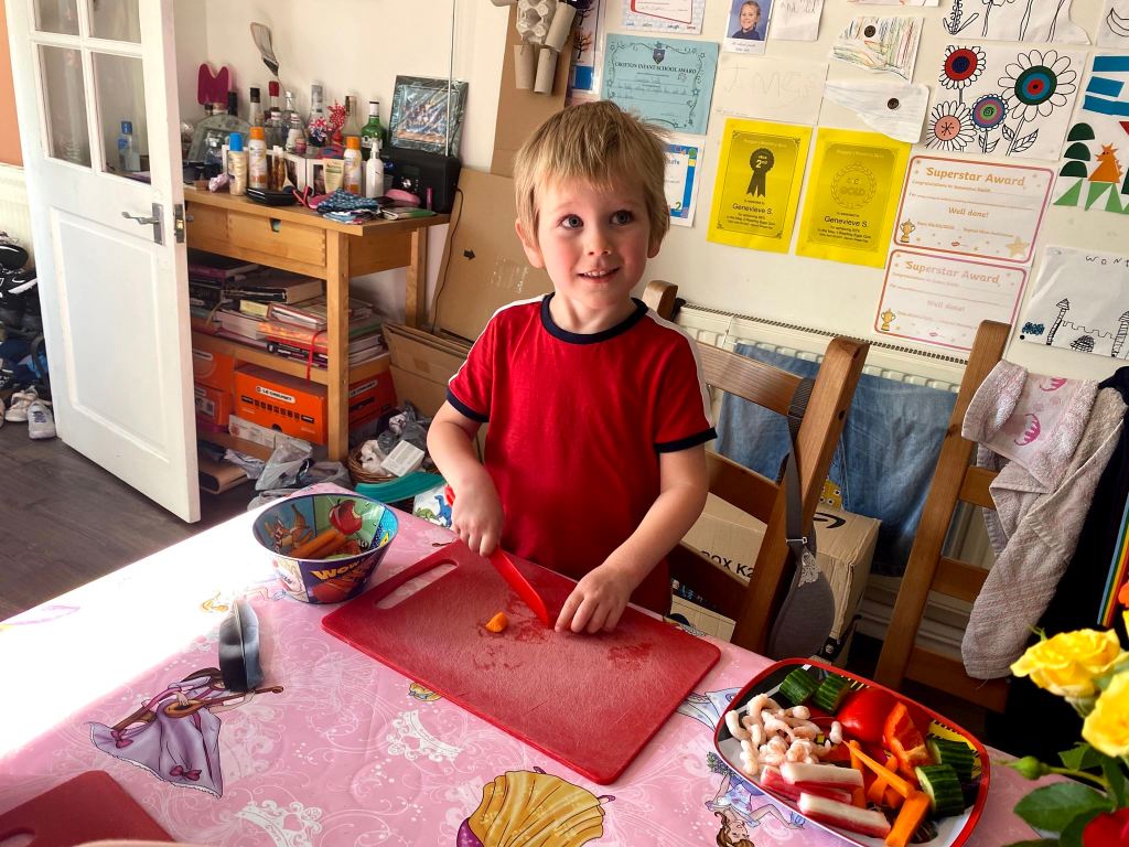 Dinner this evening was salad with prawns and crab sticks (if you’re James), and salami and avocado (if you’re Genevieve). But the best bit was that I barely did any prep. I put the ingredients in bowls and gave them plates, chopping boards and (child-safe) knives, and they cut it all for themselves. Easy. I don’t know why I haven’t done it before!