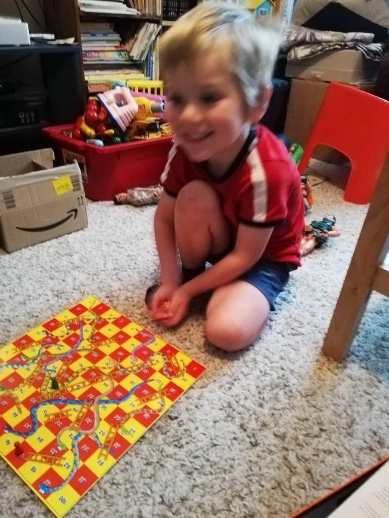 James walked with my friend Anne in the morning and played Snakes and Ladders in the afternoon.