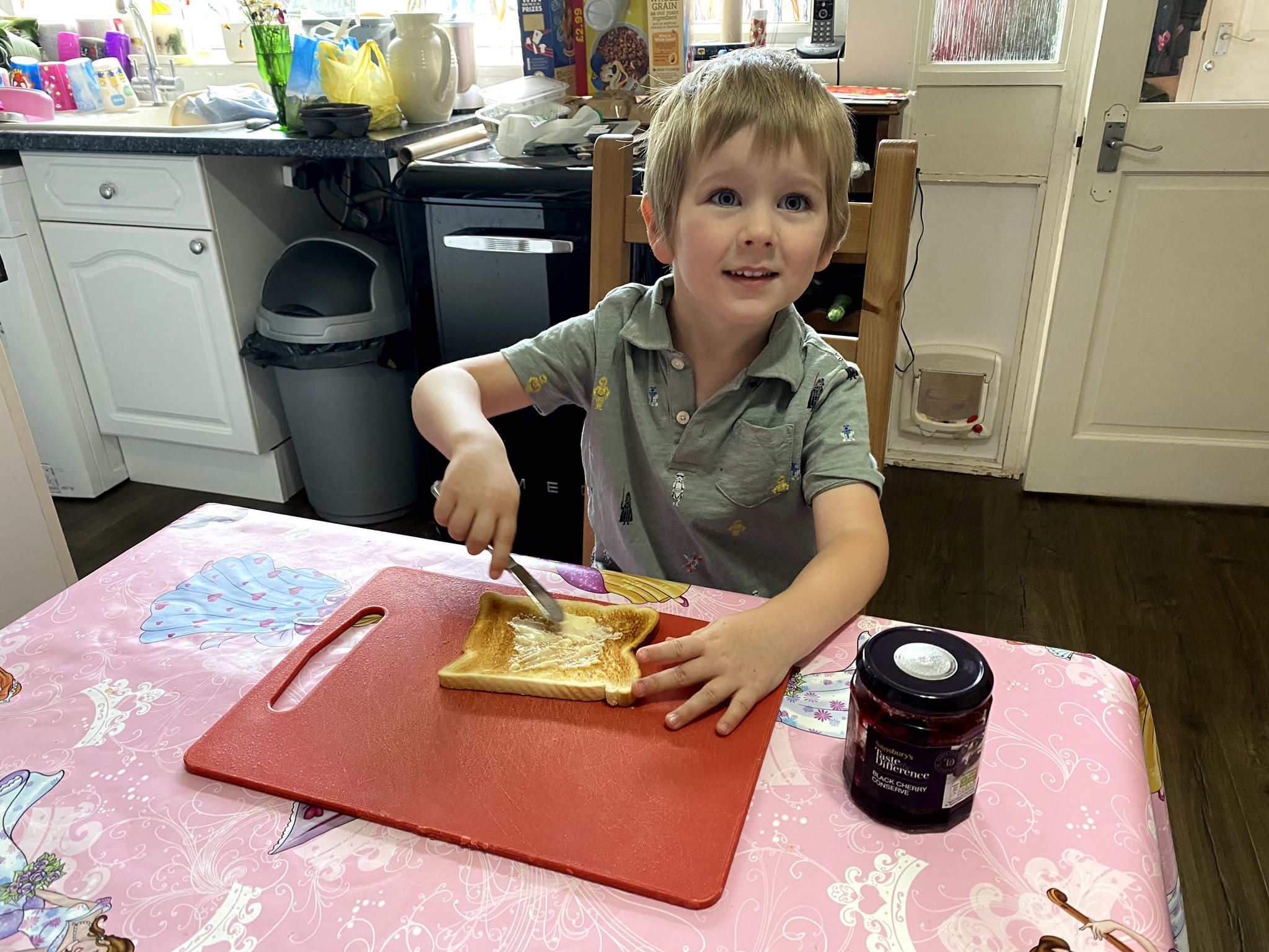 Today James made his own toast. He made a very good attempt at spreading both the butter and then the jam, and only a small amount ended up on his fingers. He was exceedingly proud of himself (and rightly so), although he needs to work on getting more of the jam in his mouth rather than on his face!